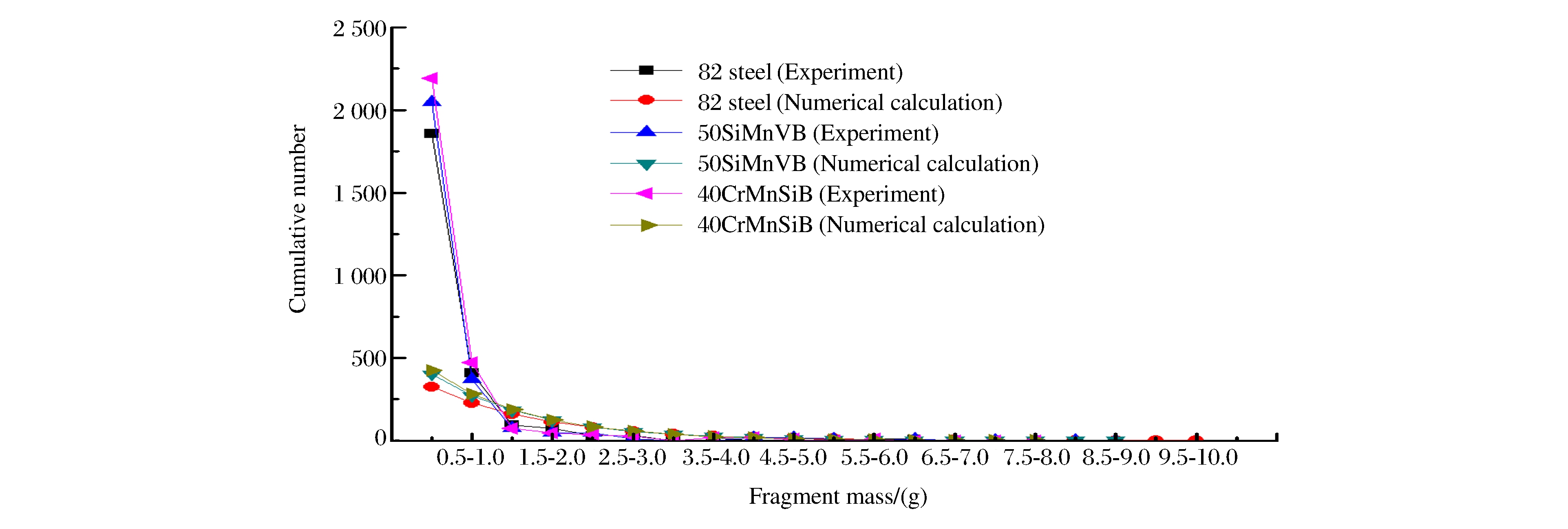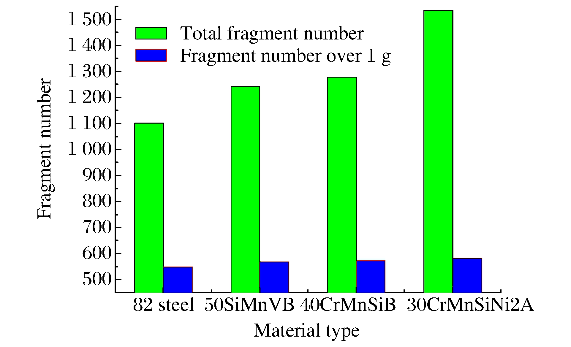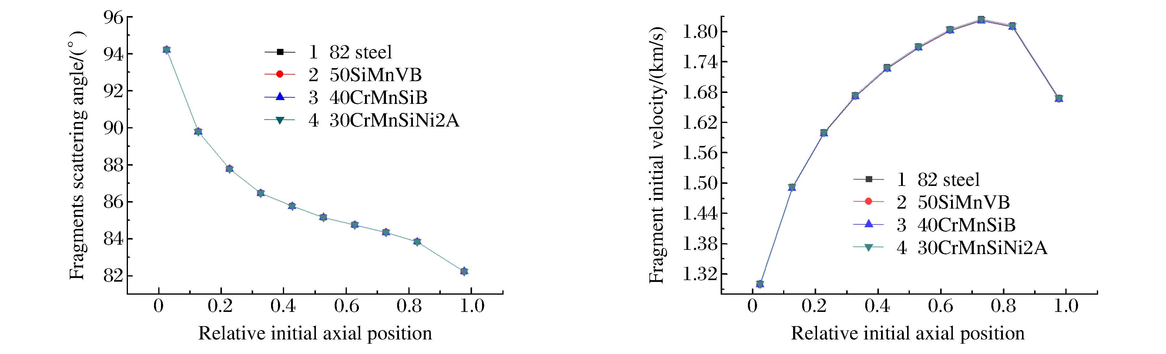为了获得弹体材料性能对破片形成的影响规律,应用破片战斗部设计软件,数值计算了82钢、50SiMnVB钢、40CrMnSiB钢及30CrMnSiNi2A钢等4种材料形成破片的情况,得到了4种材料形成的破片的飞散角、初速及质量分布的变化规律,并进行了破片质量分布的实验研究。结果表明,不同合金钢材料对形成的破片飞散角与初速的影响不大, 且沿弹体轴向方向的变化规律相同,其中破片飞散角沿弹轴方向先减小后增大,破片的最大初速出现在距起爆点约72.5%圆筒长度处;但是对破片质量分布情况的影响较大,随着材料极限抗拉强度的增加和断裂韧性的降低,弹体破碎程度升高,总破片数增加了39.3%。