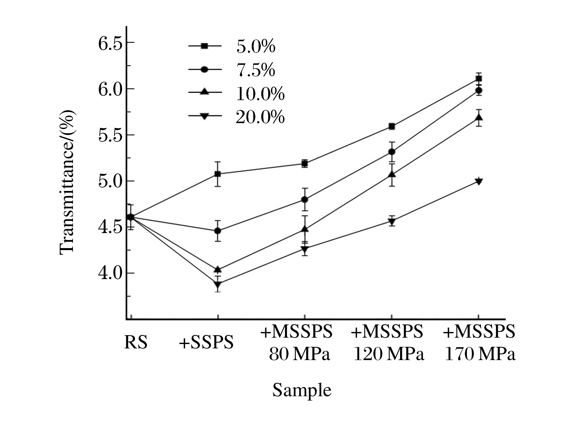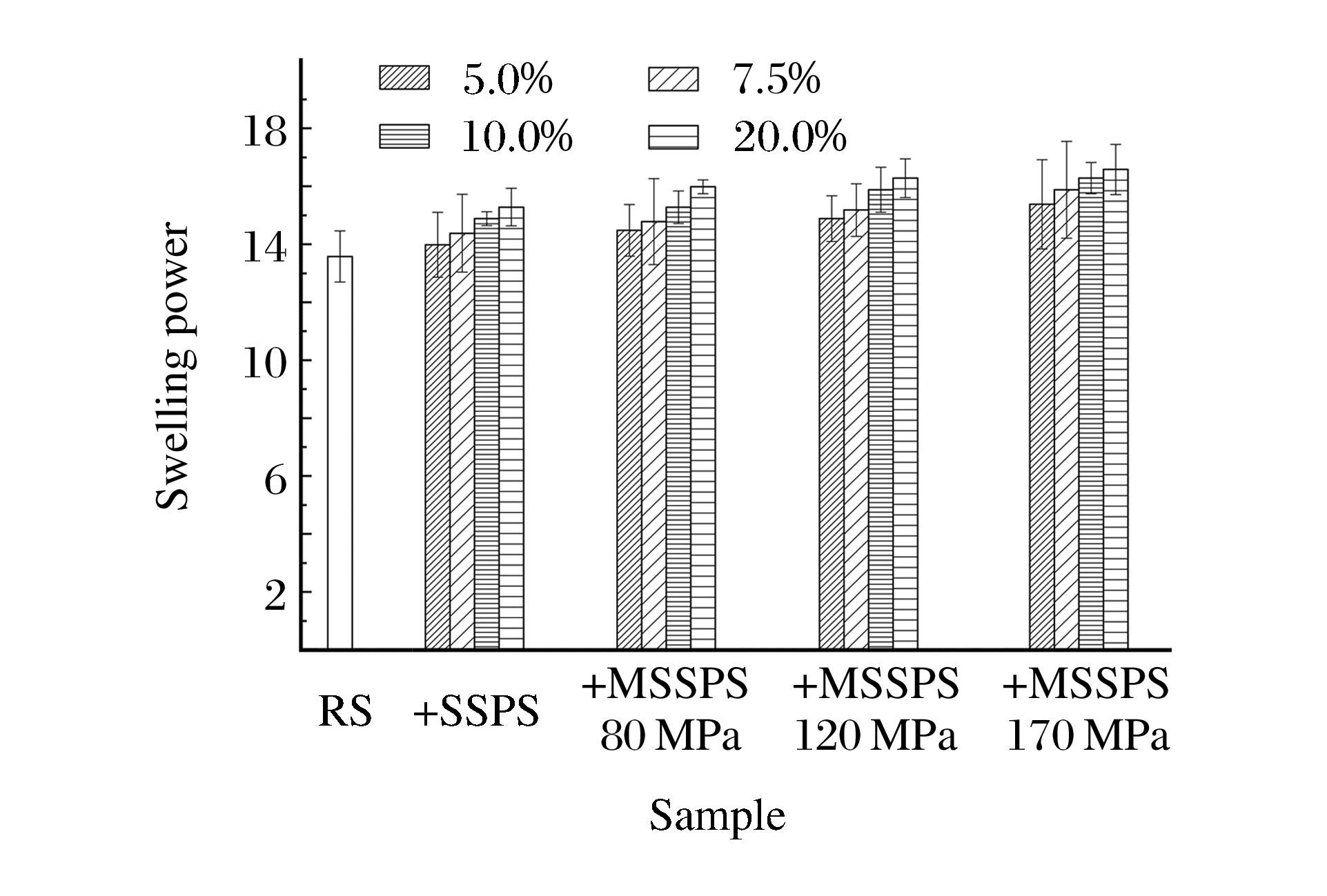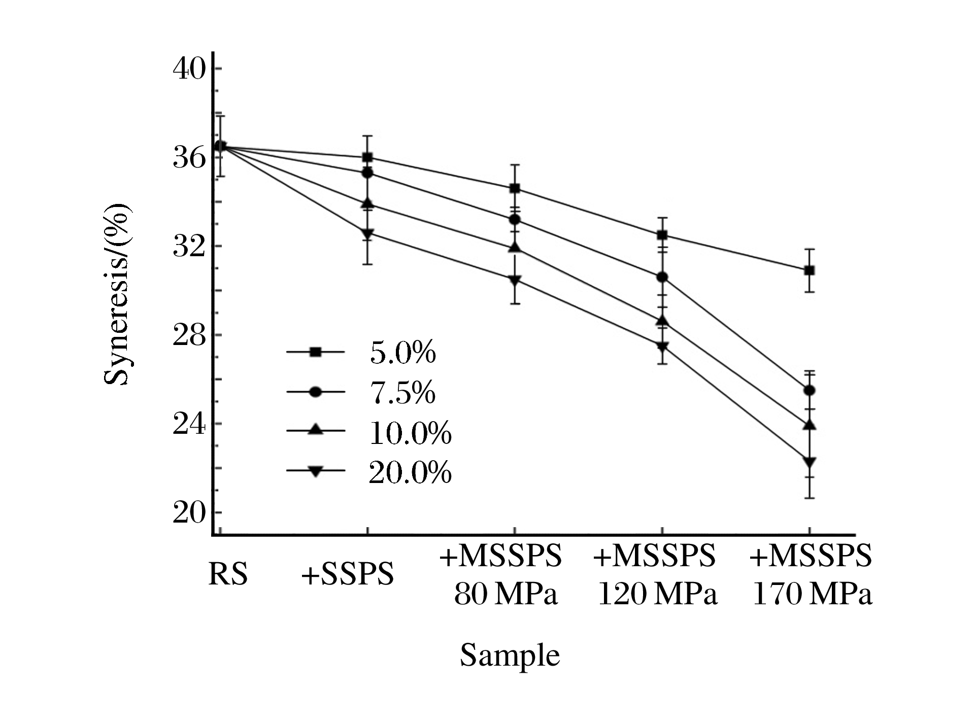 为考察改性可溶性大豆多糖(MSSPS)对大米淀粉(RS)理化性质的影响,采用动态高压微射流技术, 分别在80、120、170 MPa的改性压力下, 对可溶性大豆多糖(SSPS)进行了改性,得到了MSSPS。向多组RS中分别添加不同质量分数(5.0%,7.5%,10.0%和20.0%)的MSSPS和SSPS,研究其理化性质。结果表明:与SSPS组相比,MSSPS组RS的膨胀力、溶解度和透明度均有所提高; 多糖改性压力对RS溶解度和透明度的影响尤为明显,当压力达到120 MPa后,溶解度显著提高(P < 0.05),改性压力为170 MPa、质量分数为5.0%的MSSPS组,RS透明度可达6.1%,提高近33%;析水率和凝胶硬度则随着添加量和改性压力的增大而显著下降(P < 0.05),表明MSSPS能显著提高RS的冻融稳定性,及改善储藏过程中RS的硬化等质构品质。用扫描电镜观察添加MSSPS前、后,4 ℃下老化7 d的RS冻干样品,显示其结构变化为:中空腔壁变薄,空腔变大,类似蜂窝状的结构增多,故从微观结构上证明了MSSPS能降低RS析水率,提高冻融稳定性。研究结果表明:MSSPS对RS理化性质有显著影响,可通过提高冻融稳定性、透明度等,改善淀粉的外观、可接受度和质构品质。