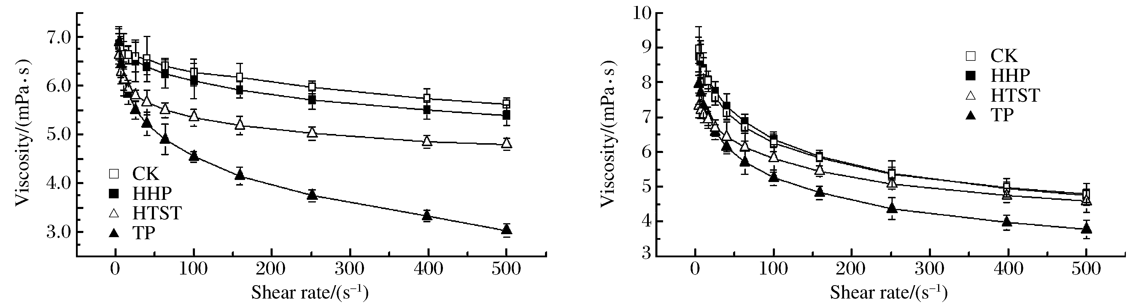 研究超高压(常温下,550 MPa,处理5 min)、热处理(中心温度90 ℃,处理1 min)及高温短时杀菌(110 ℃,处理8.6 s)对草莓浊汁和清汁品质的影响。结果表明:(1)经超高压处理后,草莓浊汁的黏度、果胶含量和浊度无显著变化,悬浮稳定性显著增加;而热处理和高温短时杀菌处理后,浊汁的黏度和果胶含量显著减小,浊度增大,悬浮稳定性降低,但高温短时杀菌组好于热处理组;(2)草莓浊汁和清汁经超高压处理后Vc分别损失11.09%和13.59%,而热烫结合超高压处理后分别损失7.75%和10.73%;热处理和高温短时杀菌组浊汁和清汁中Vc的损失率高于超高压组,分别为28.86%~38.89%和20.38%~29.02%;(3)超高压处理对草莓浊汁和清汁的单体花色苷、聚合色度及总酚含量、DPPH和FRAP抗氧化活性没有显著影响;热处理和高温短时杀菌处理后草莓浊汁中的花色苷总量分别损失了3.89%~4.63%和7.46%~8.02%,而清汁中分别损失了5.97%~6.02%和8.09%~9.20%;聚合色度和聚合色度百分比增加,总酚含量无显著变化,抗氧化活性显著降低;(4)超高压处理对草莓浊汁和清汁的亮度L*、红值a*、黄值b*、彩度C*及色调角hab均没有显著影响;而热处理和高温短时杀菌处理使L*值和a*值均显著减小。