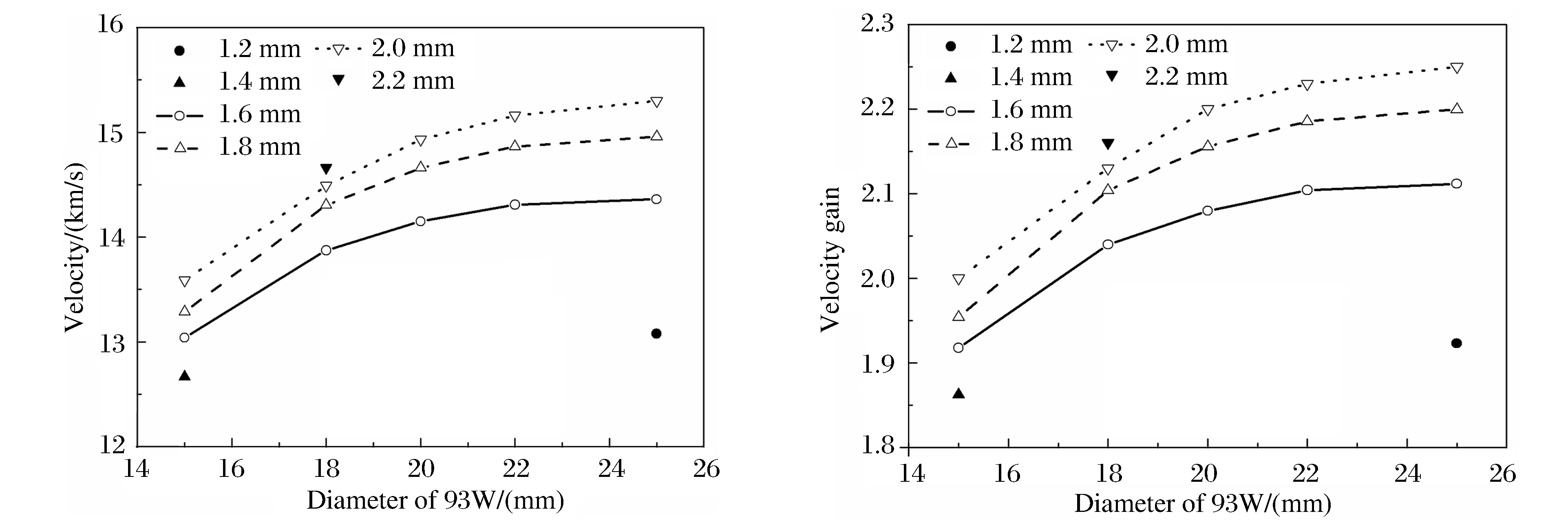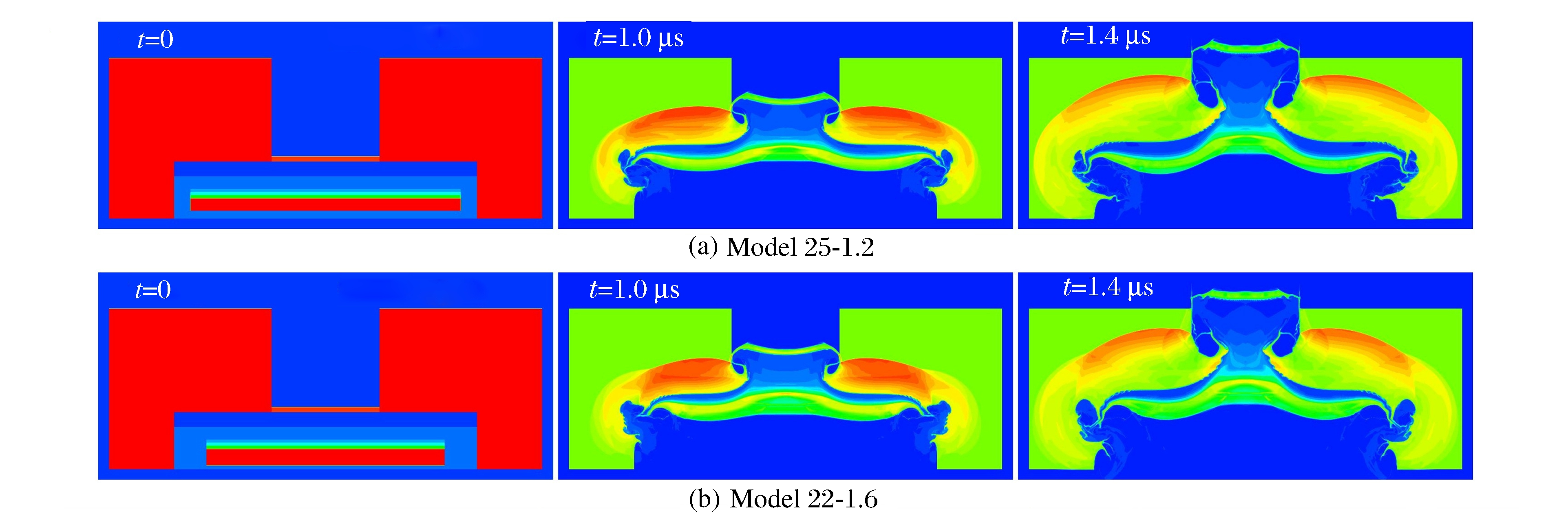 在利用汇聚型超高速发射装置进行超高压条件下物质状态方程测量时,二级飞片需要具有平面性好、击靶速度高的特点。为此采用具有自主知识产权的多介质流体高精度欧拉并行计算程序HVL-MFPPM,对汇聚型超高速发射装置进行了数值模拟,优化设计了一级飞片93W层的结构。计算结果表明:当采用最优设计方案时(93W层的直径为20 mm,厚度为1.8 mm),一级飞片能够将克级的二级飞片加速到14 km/s以上;同时,这种设计可以提高速度增益和汇聚效果,并大幅度地改善二级飞片在发射管出口处的平面性。