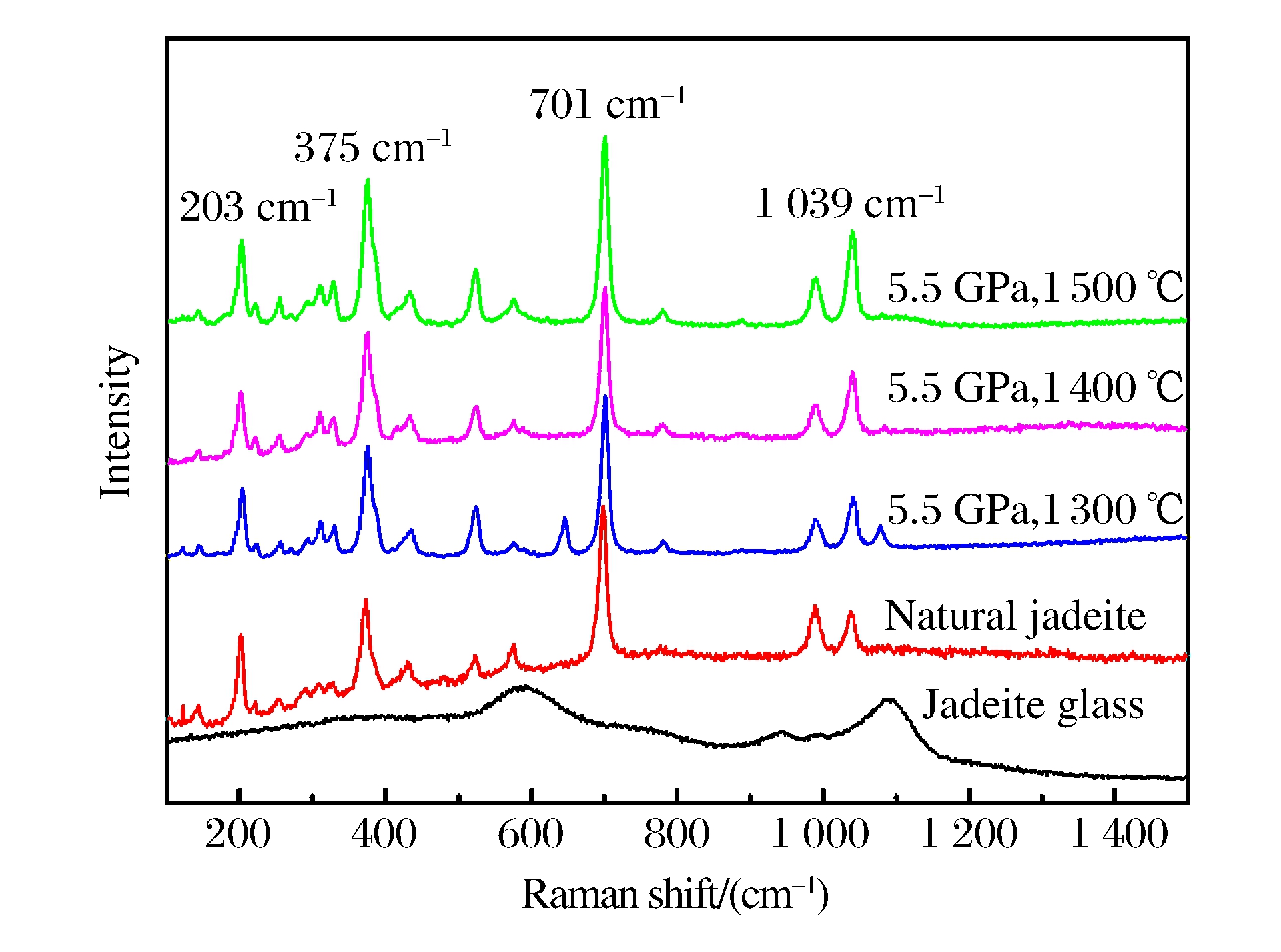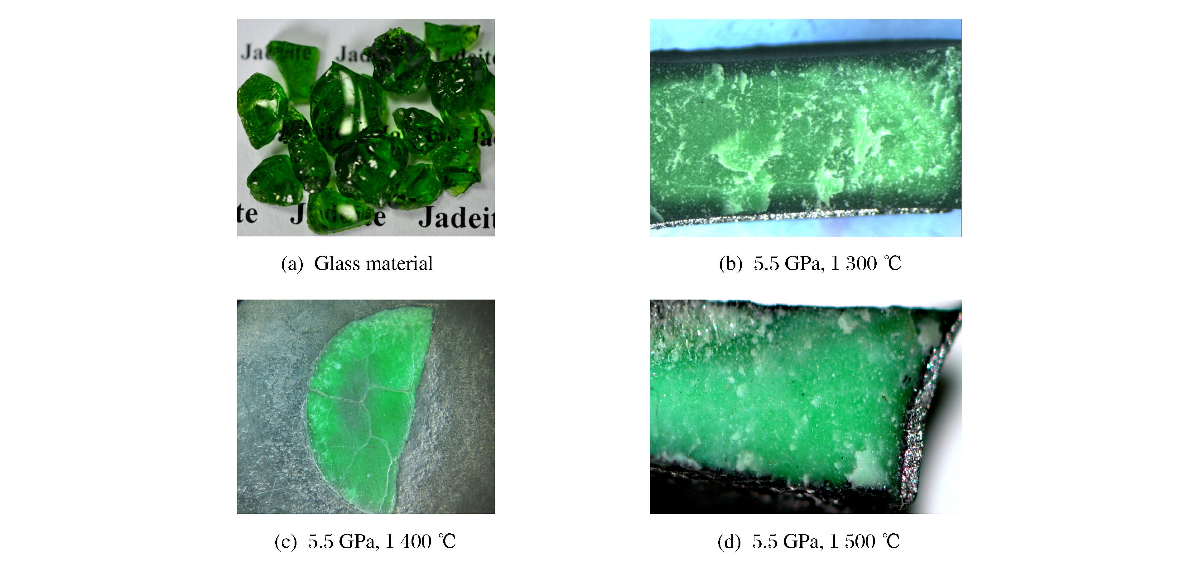 模拟天然翡翠成矿原理,采用优化的合成工艺,在高温高压下将非晶质的翡翠成分粉末转化为晶态翡翠,部分合成翡翠的质地温润细腻、色泽均匀,具有高档翡翠的品质。X射线衍射(XRD)物相分析和扫描电镜(SEM)显微分析结果表明:合成样品结晶矿物为硬玉,且结晶程度较好,晶粒细密,编织致密有序。拉曼光谱显示,合成翡翠的拉曼特征峰位与天然翡翠一致,且谱线尖锐,表明其结晶程度高。合成翡翠的硬度、密度和热稳定性等常规宝玉石参数也与天然翡翠接近。研究发现,在实验所采用的温度、压力范围内,温度对合成翡翠晶粒的生长和编织情况有很大的影响。
