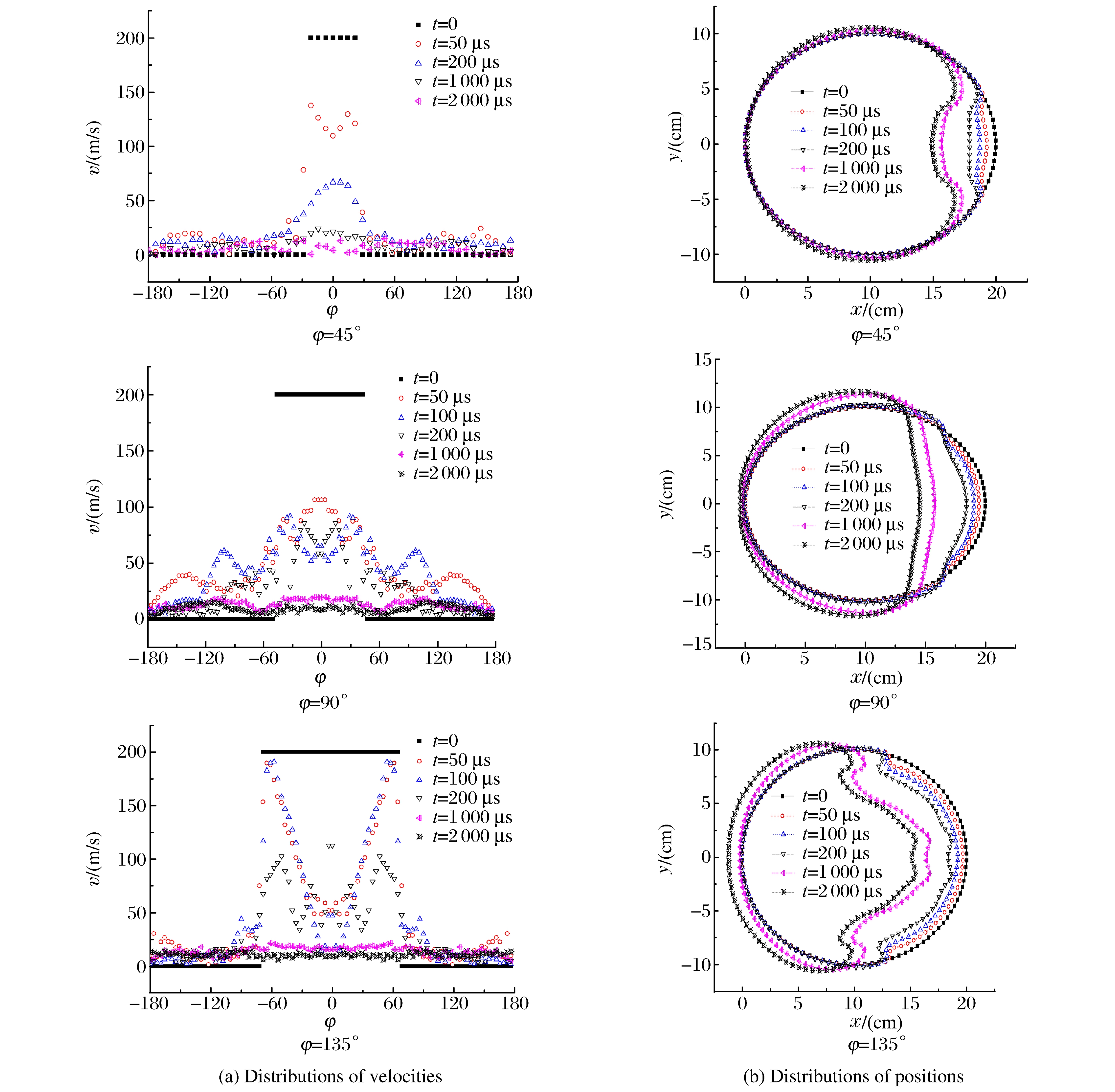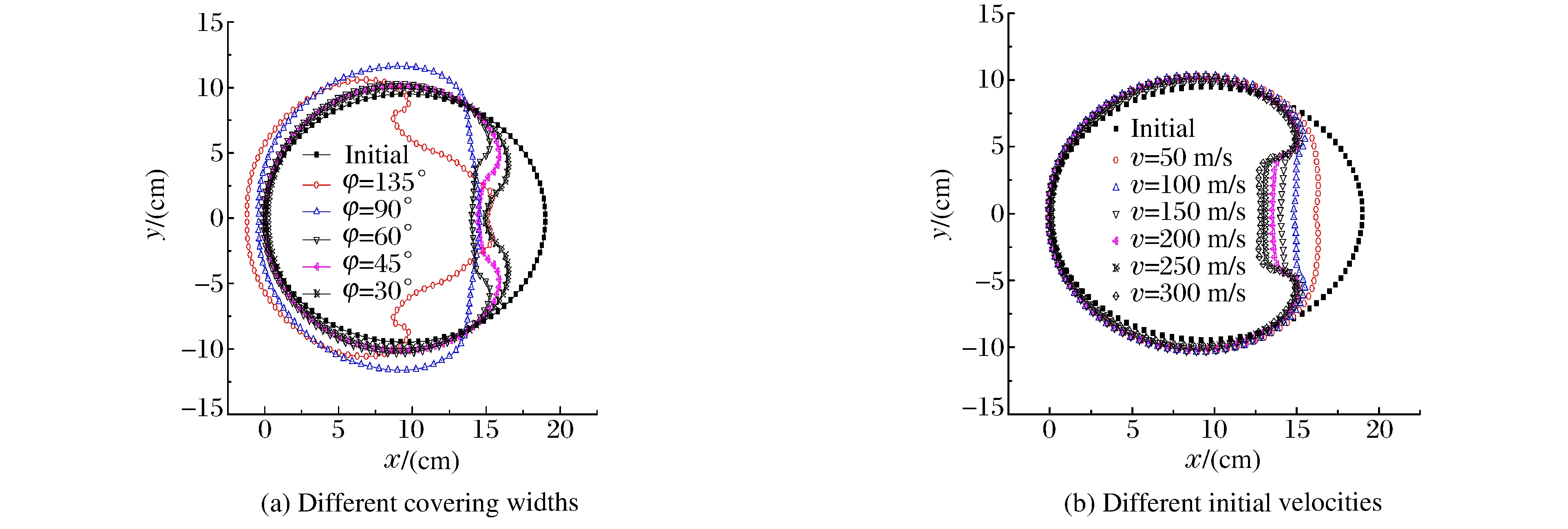 对填充介质圆柱壳在侧向爆炸冲击作用下的变形型面进行了实验研究,获得了圆柱壳的最终变形型面。基于刚塑性动力学中的塑性铰理论建立了相应的分析模型,将圆柱壳划分为多个首尾相连的刚性方杆,利用方杆的平动、转动描述圆柱壳的变形过程,详细推导了相邻方杆间弹簧力、弯矩和偏折角等的表达式,考察了侧向炸药覆盖宽度和圆柱壳初始速度等因素对变形型面的影响。研究结果表明:所建立的分析模型能够有效地预测圆柱壳的变形型面,侧向炸药覆盖宽度和爆轰威力是影响圆柱壳最终变形型面的关键因素,可通过调整侧向炸药的覆盖宽度和圆柱壳初始速度实现不同的圆柱壳变形型面。
