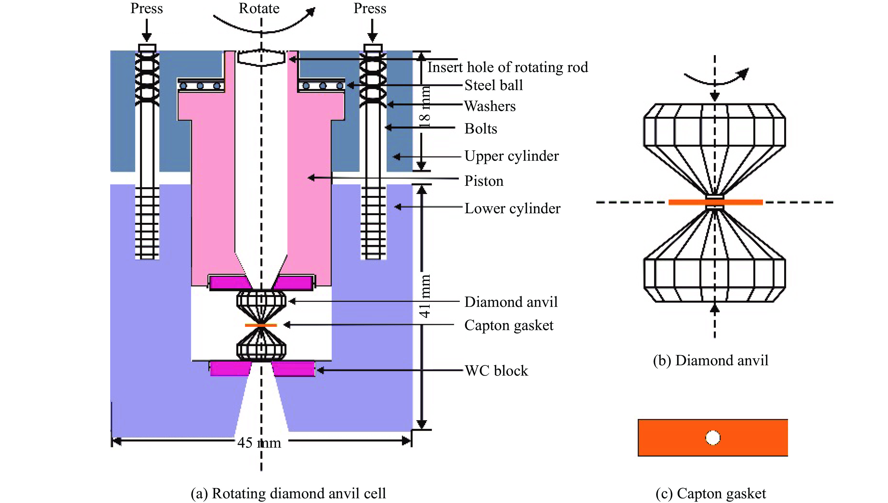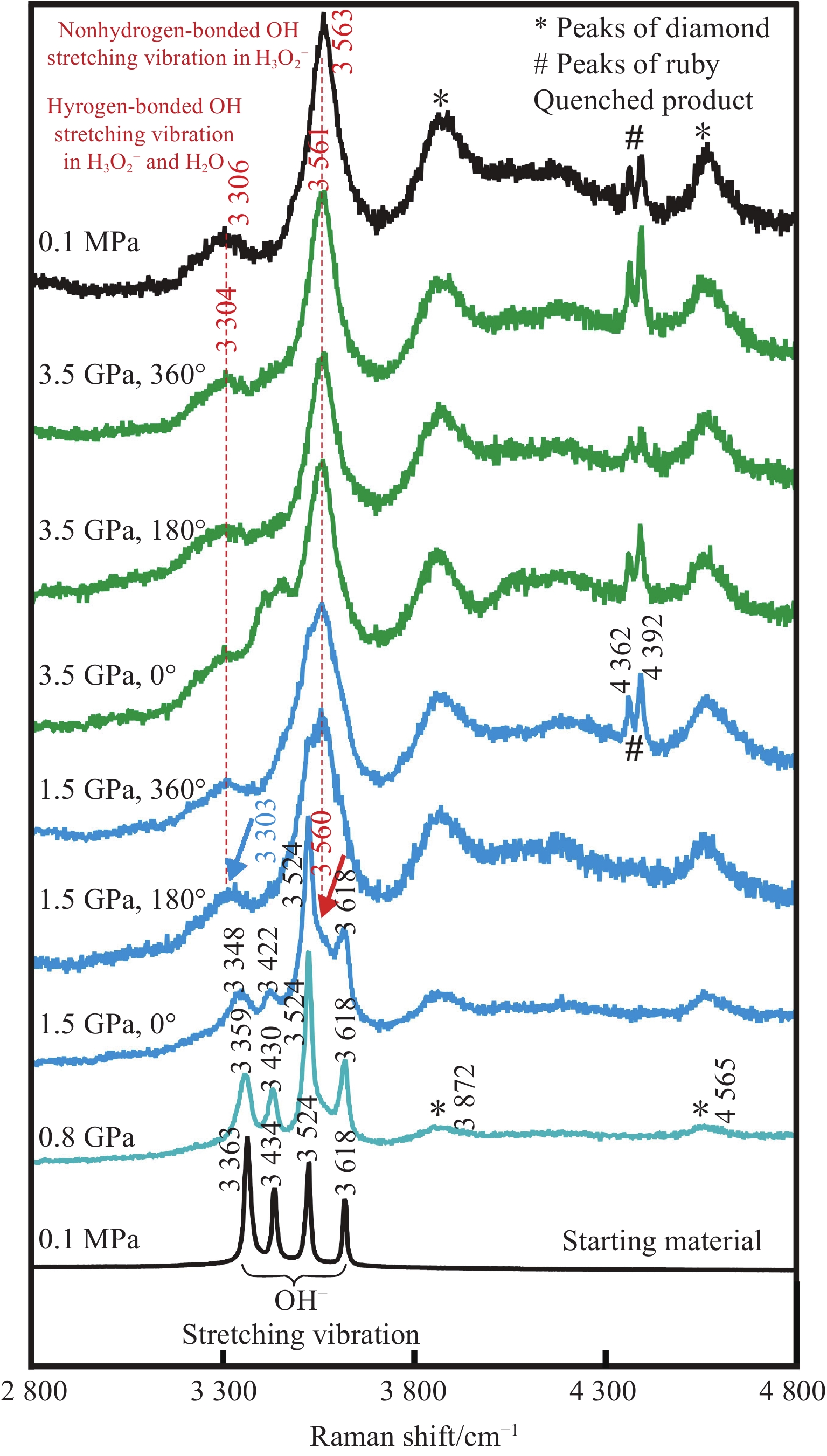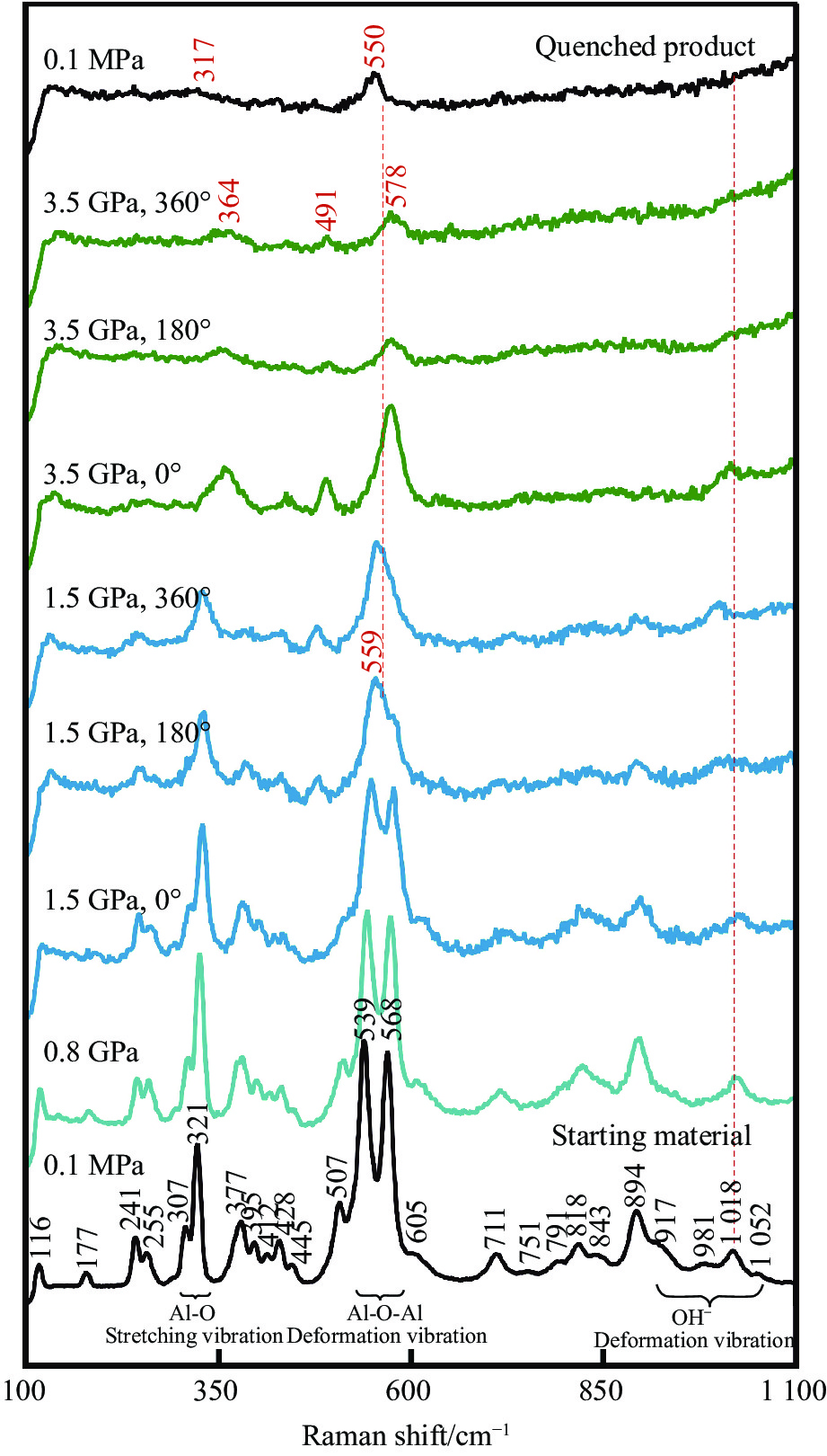 利用旋转式金刚石对顶砧压机(RDAC)结合显微激光拉曼光谱和微区X射线衍射,研究了三水铝石($\gamma $-Al(OH)3)在高压剪切作用下的结构稳定性。常温加压至1.5 GPa,旋转180°后,$\gamma $-Al(OH)3的结构开始转变。初始样品在高波数段的4个羟基伸缩振动峰(3 363、3 434、3 524和3 618 cm−1)相继消失,出现3 303和3 560 cm−1 2个新峰。低波数段拉曼谱强度明显减弱,无非晶态宽峰;Al-O-Al变形振动双峰(568、539 cm−1)和Al-O伸缩振动肩峰(321和307 cm−1)分别融合为一个振动峰;4个羟基变形振动峰(1 052、1 018、981和922 cm−1)仍然可见。继续加压至3.5 GPa,旋转360°后卸至常压,高波数段新出现的两个羟基伸缩振动峰、原Al-O-Al变形振动峰和Al-O伸缩振动峰仍然可见。对比准静水压条件下$\gamma $-Al(OH)3高压相的拉曼谱和相转变压力(约2.7 GPa),认为常温高压剪切作用下$\gamma $-Al(OH)3脱羟基生成了H2O和${\rm{H}}_3{\rm{O}}_2^- $。卸压样品微区的X射线衍射谱进一步揭示,在高压剪切作用下,$\gamma $-Al(OH)3的(OH)-Al-(OH)配位八面体骨架被破坏,沿c轴方向原子叠加的层间距缩小,对称性增强。这种不同于准静水压实验的结构改变来自腔体内压力的不均匀分布(0.5~4.5 GPa)。高压剪切作用下,三水铝石的结构稳定性研究对查明板块冷俯冲带中含水矿物的稳定性,推演俯冲板片的物理化学性质以及板块俯冲的速率具有重要意义。