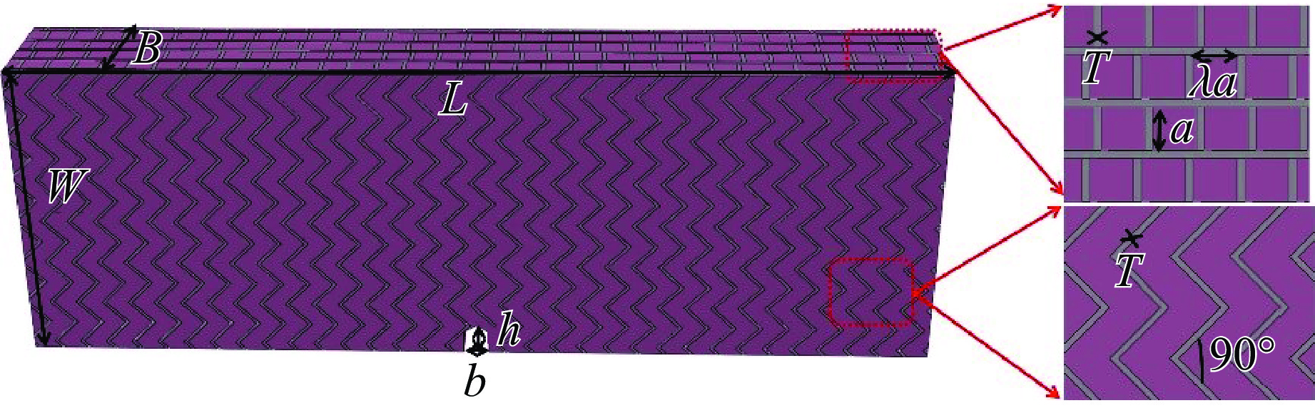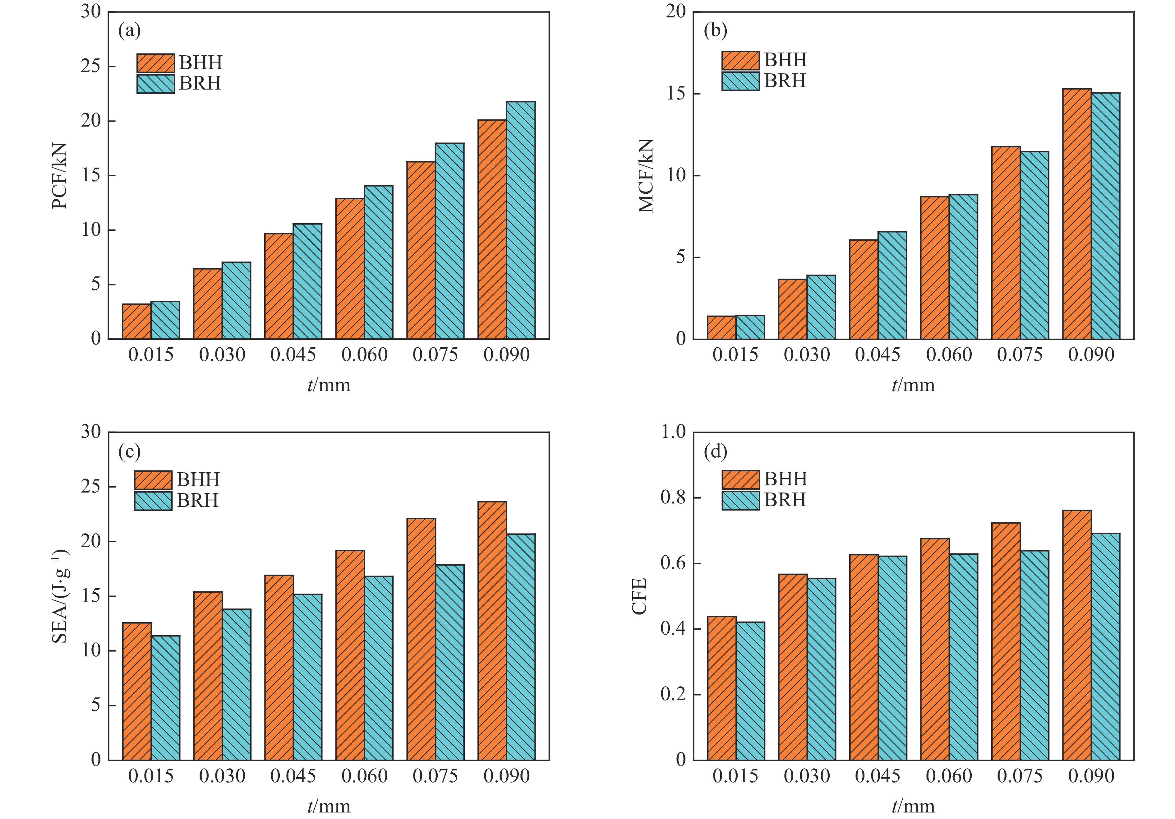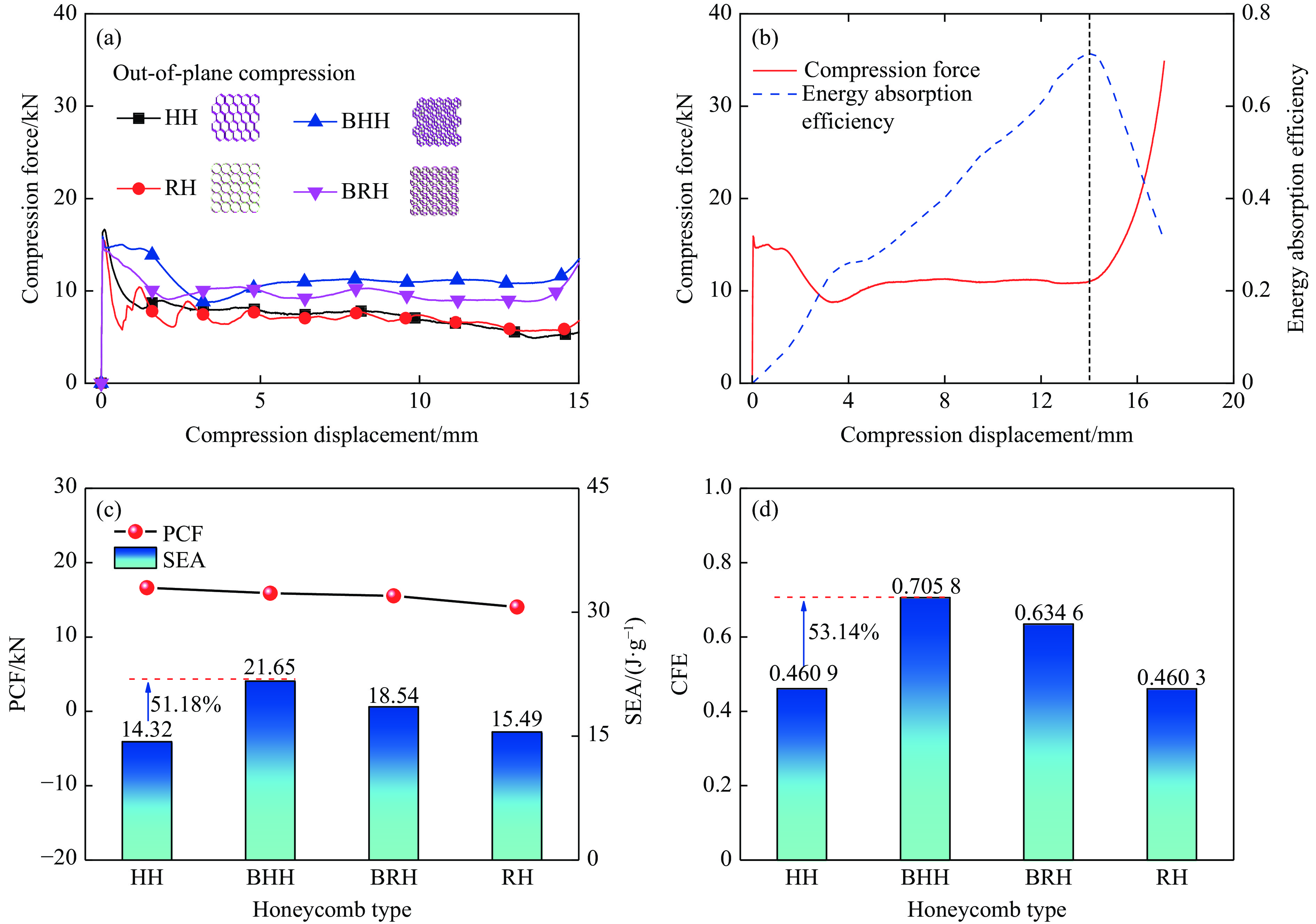 受自然界毛竹微观结构的启发,在传统圆管与六边形管的基础上引入内管及双菱形肋骨,通过拓扑衍生方法设计了两种新型仿生蜂窝结构。在此基础上利用有限元软件ABAQUS对新型仿生蜂窝的耐撞性进行数值模拟,研究了蜂窝单胞构型、蜂窝壁厚、双菱形肋骨夹角对仿生蜂窝耐撞性能的影响。此外,基于超折叠单元理论,建立了仿生蜂窝结构的理论分析模型。结果表明:仿生蜂窝的面外压缩耐撞性能优于传统圆形蜂窝和传统六边形蜂窝。新型仿生六边形蜂窝的比吸能相比传统六边形蜂窝提高51.18%,压缩力效率提高53.14%。仿生蜂窝结构的平均压缩力理论预测结果与数值模拟结果吻合,两者间的误差均在10%以内。单胞构型为六边形的仿生蜂窝的耐撞性能优于圆形仿生蜂窝。适当增加仿生蜂窝壁厚或增大双菱形肋骨夹角,均有利于提高结构的耐撞性能。