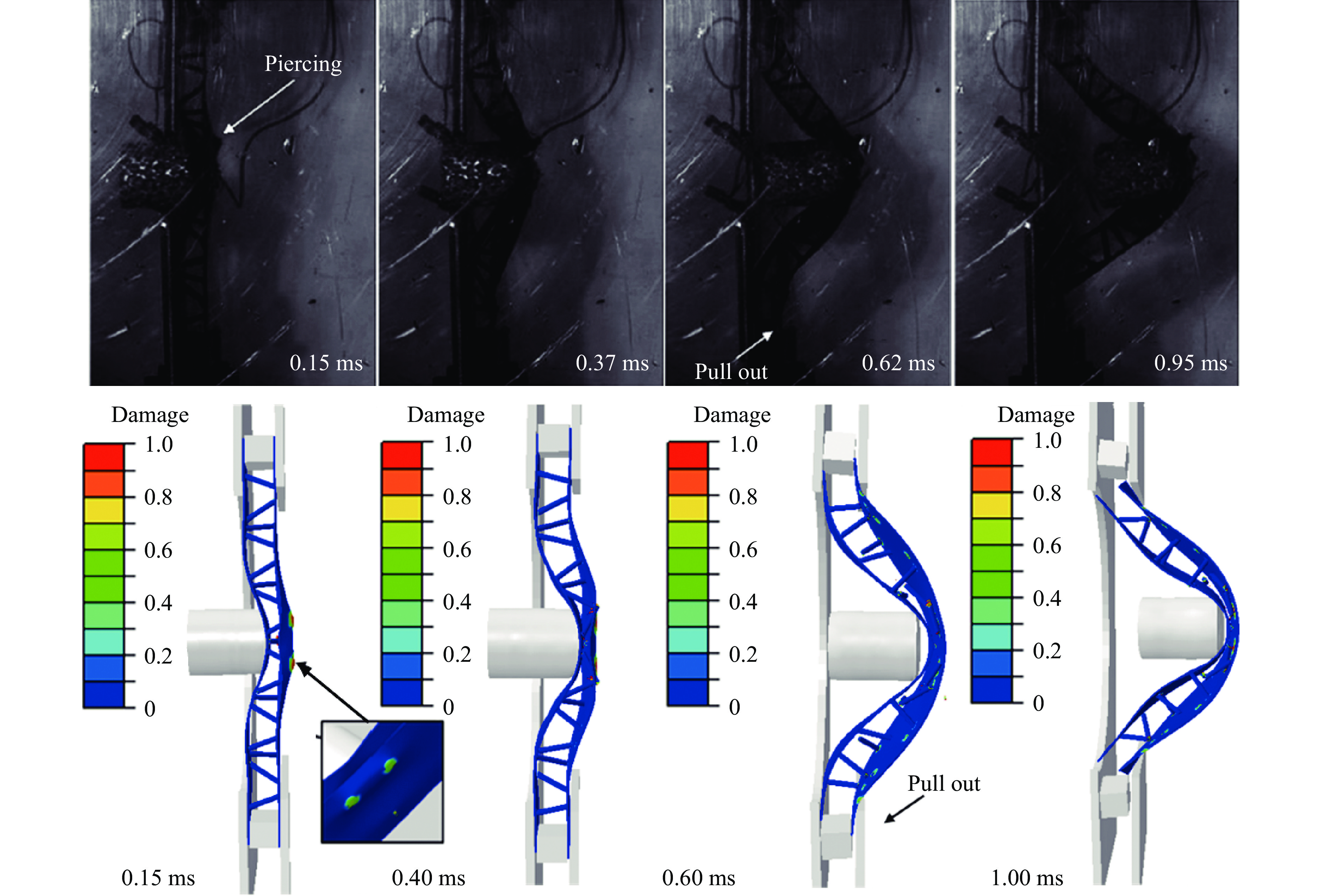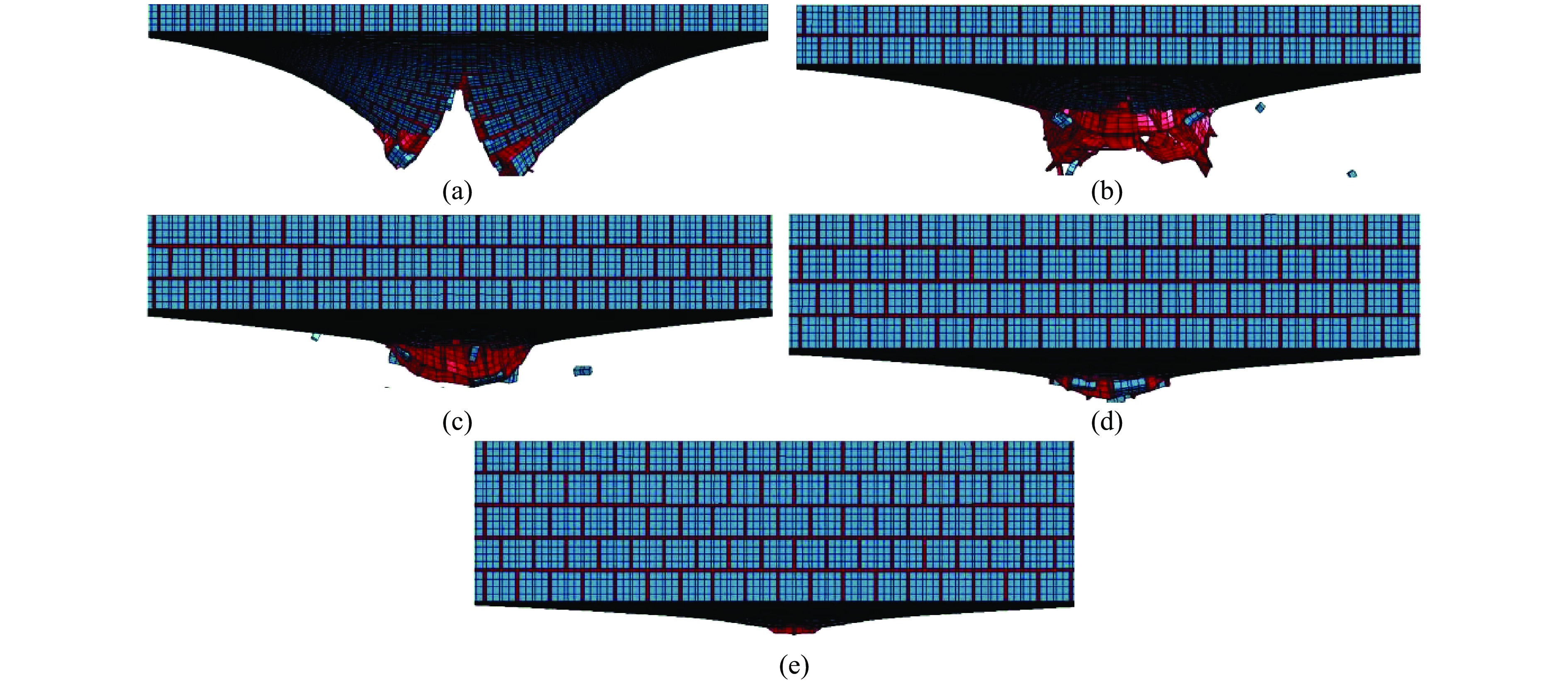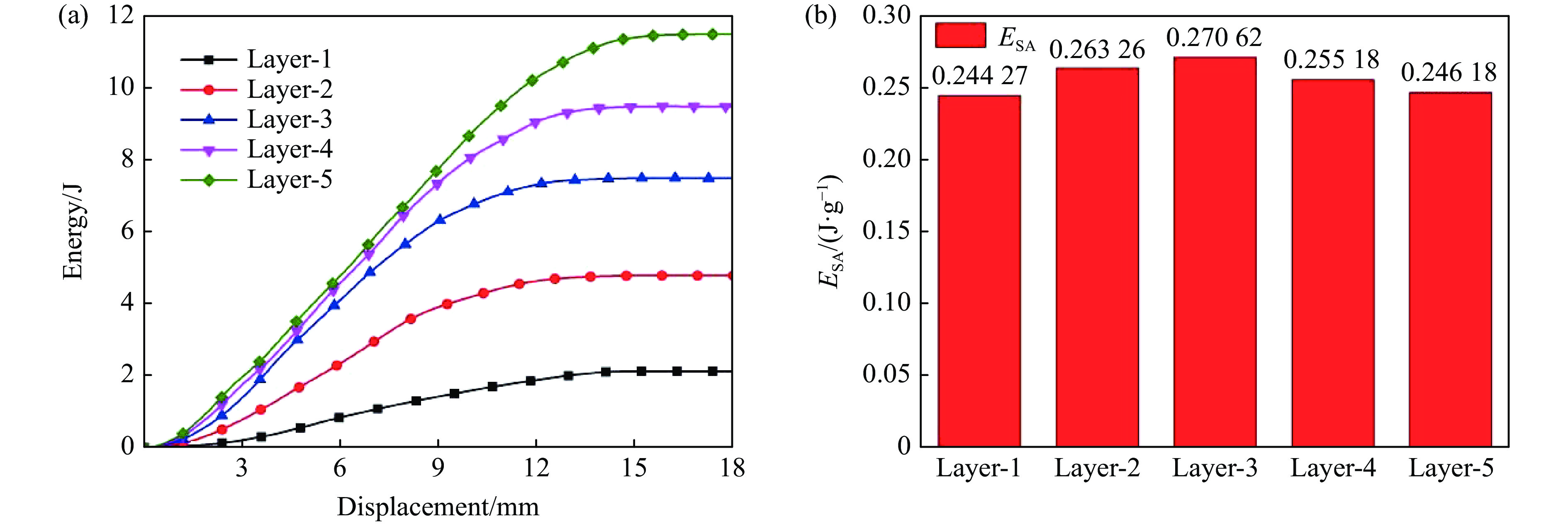 贝壳作为典型的抗冲击生物材料,具有轻质、高强、高韧等优异性能。通过构建仿贝壳砖泥结构有限元模型,并对其在落锤冲击载荷下的动态响应进行数值模拟,分析了堆叠层数、冲击速度及锤头类型对仿贝壳砖泥结构能量吸收性能的影响。结果表明:5类堆叠层数下的仿贝壳砖泥结构的比吸能呈先增加后减小的变化趋势,并且在所设计的5类堆叠层数结构中,3层仿贝壳砖泥结构具有最大的比吸能,其值较比吸能最小的单层结构提高了10.8%;随着冲击速度的提升,结构载荷峰值及能量吸收均略有增大;相同锤径下,圆柱形锤头较半球形锤头更易穿透模型。