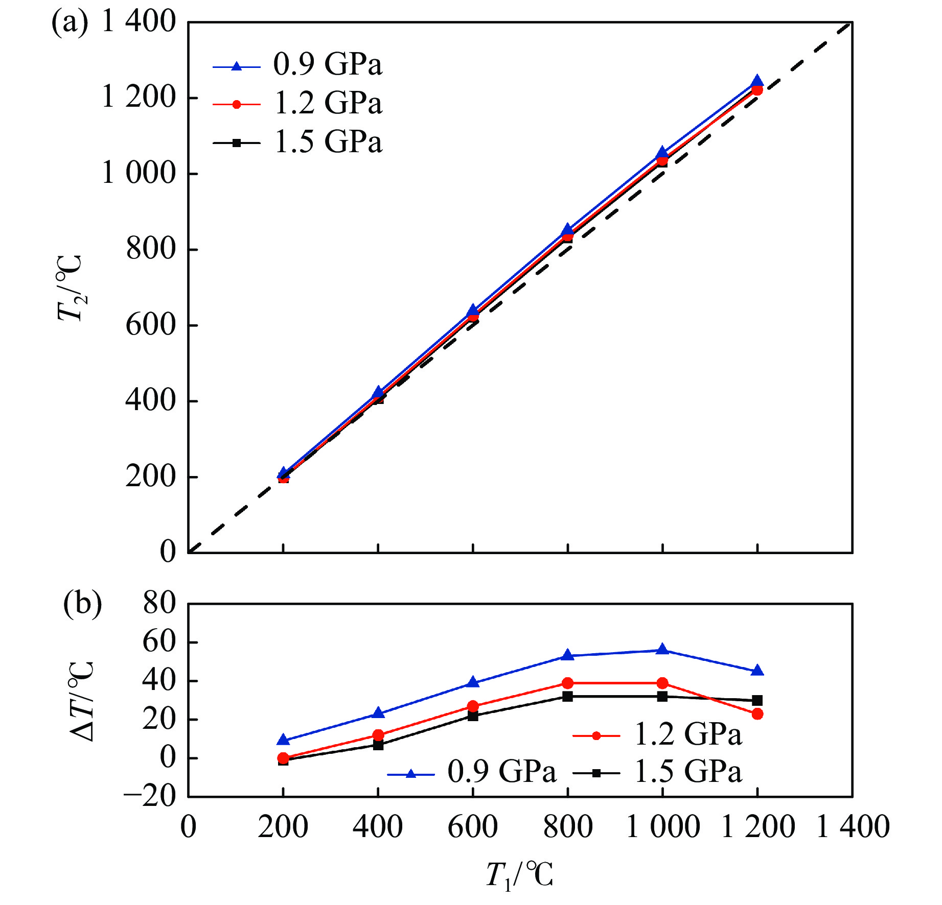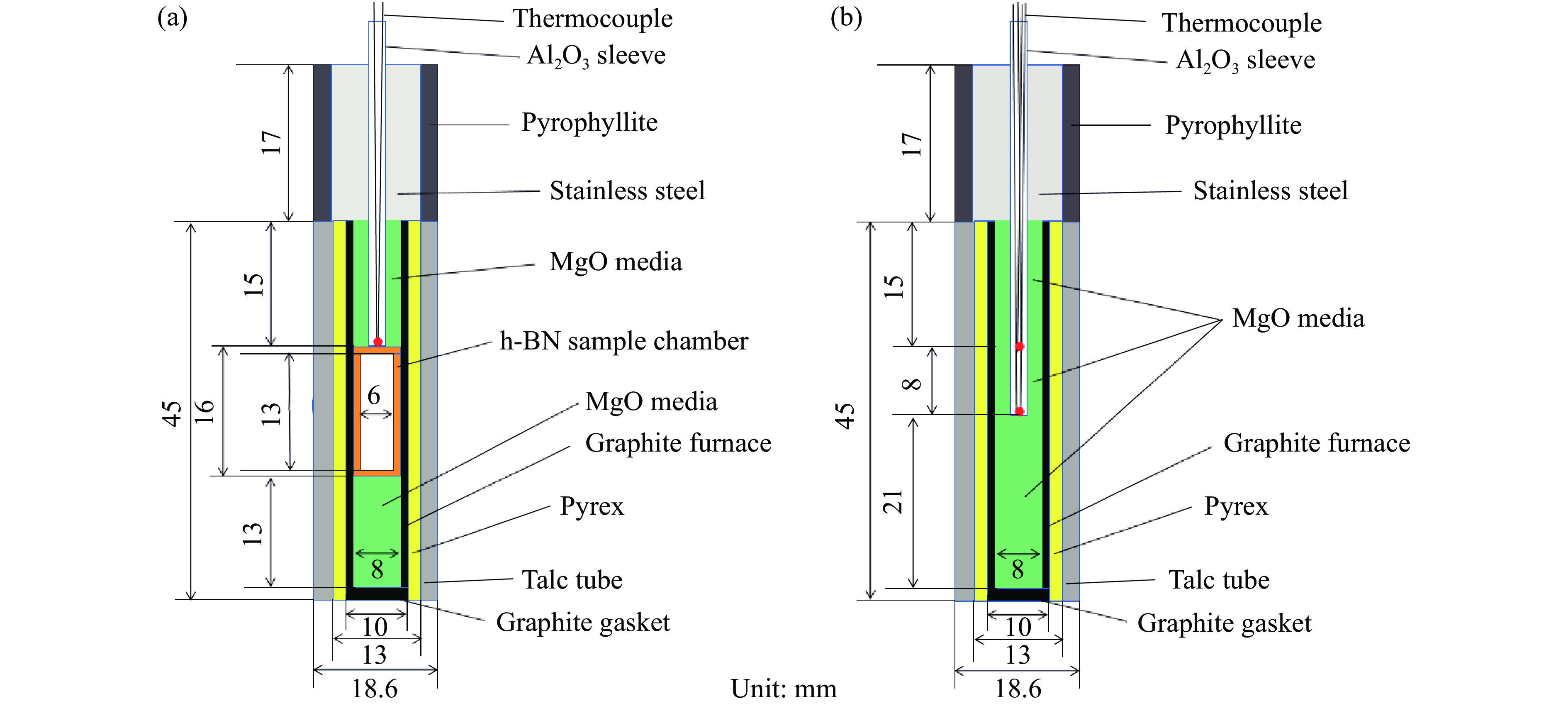 在高温高压实验中,样品所处位置的压强、温度及样品腔温度分布情况对实验结果分析十分重要,因此使用高温高压实验装置前需对所用组装进行压强和温度标定。针对双向活塞圆筒装置19 mm外径样品组装,进行了压强与温度标定。利用氯化钠(NaCl)在高压下的熔化曲线对压强进行标定,当下油缸油压出现大幅度下降时,样品腔内的NaCl发生熔化,将此时热电偶测量的温度与文献报道的NaCl在高压下的熔化曲线进行比较,确定样品腔内的实际压强。压强标定结果显示,实际压强与目标压强满足线性关系。采用双热电偶法对19 mm外径样品组装样品腔的中部和上部进行测温,发现样品腔中心温度高于样品腔上部温度,温度梯度随温度升高而增大,随压强升高而减小。在二次加压升温时,样品腔内的温度梯度高于第一次加压升温实验测量结果。所得压强和温度标定结果对今后使用19 mm外径样品组装开展高温高压实验研究具有参考价值和指导意义。