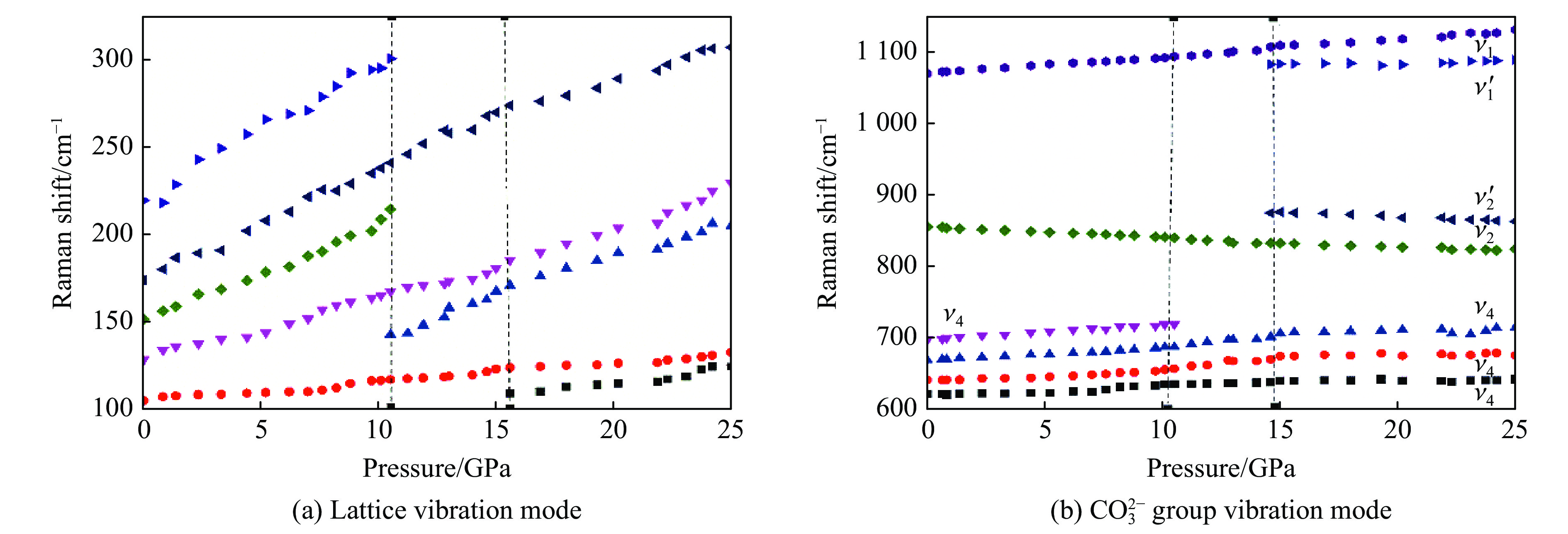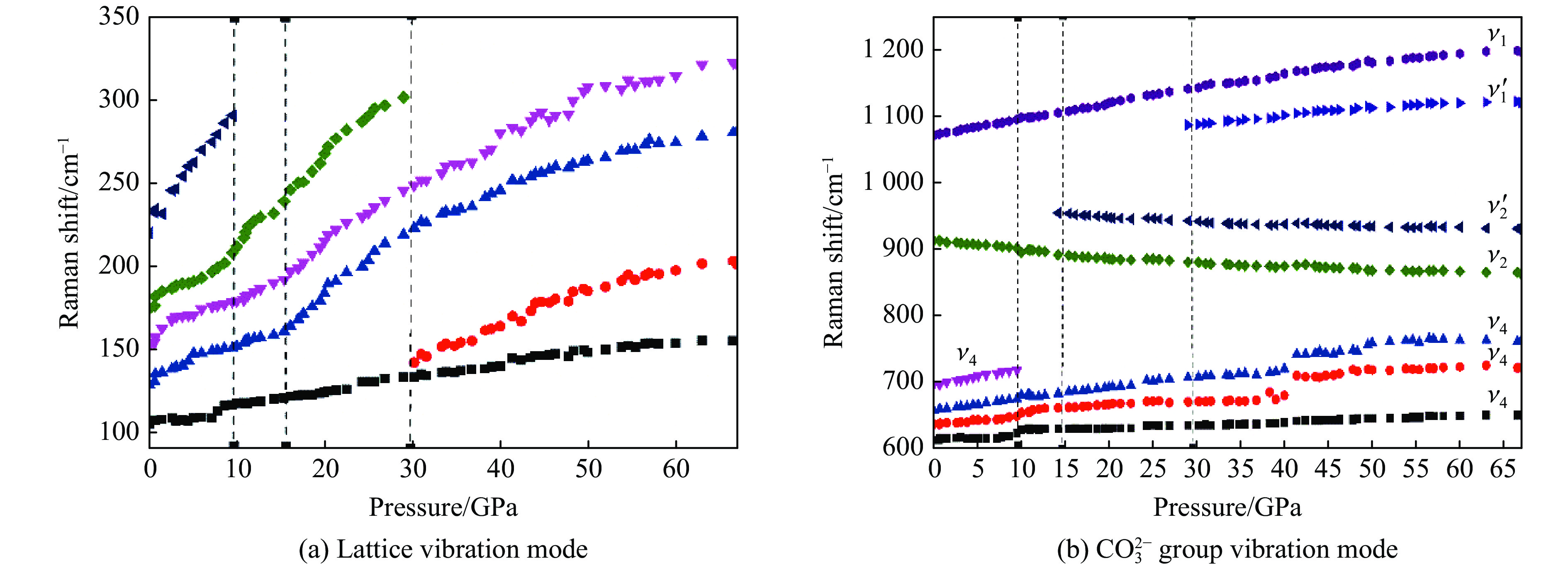 为研究PbCO3在高压下的稳定性,利用金刚石对顶砧技术,采用NaCl固体、甲醇-乙醇-水混合液体(16∶3∶1)和甲醇-乙醇混合液体(4∶1)做传压介质,开展了PbCO3的高压拉曼实验,最高压强分别达到24.5、25.0和67.0 GPa。研究发现,PbCO3在10、15和30 GPa左右发生相变,在静水压强条件下${\rm{CO}}_3^{2-} $基团的ν2-外弯曲振动模出现了软化现象。通过对比得到不同传压介质中PbCO3的Grüneisen参数γ,发现相变机制略有不同,并且压强对晶格振动的影响比${\rm{CO}}_3^{2-} $基团的影响大,这是由Pb2+―O键的键长较大造成的。在所研究的压强范围内,PbCO3没有发生分解或非晶化,30.0 GPa以上出现的PbCO3-Ⅳ相直至67.0 GPa都很稳定。