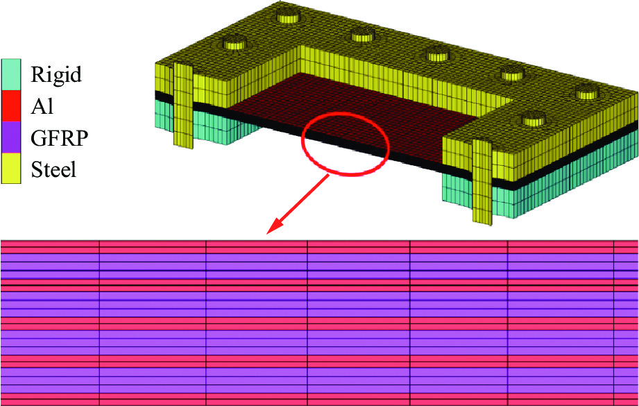 热塑性纤维金属层合板作为具备优良抗冲击潜能的复合材料,在舰船防护领域受到广泛关注。以热塑性纤维金属层合板为研究对象,基于封闭空间内爆炸载荷作用下层合板动态响应试验数据,以及通过代表体积元(representative volume element, RVE)方法计算得到的纤维板材料参数,开展了热塑性纤维增强金属层合板的数值模拟研究。通过试验结果与数值模拟结果的对比,验证了数值模拟方法的有效性,进一步分析了层合板的响应规律。所采用的热塑性纤维金属层合板舱内爆炸响应数值模拟方法对研究层合板抗冲击性能具有一定的借鉴意义,为相关研究的进一步开展提供了思路。