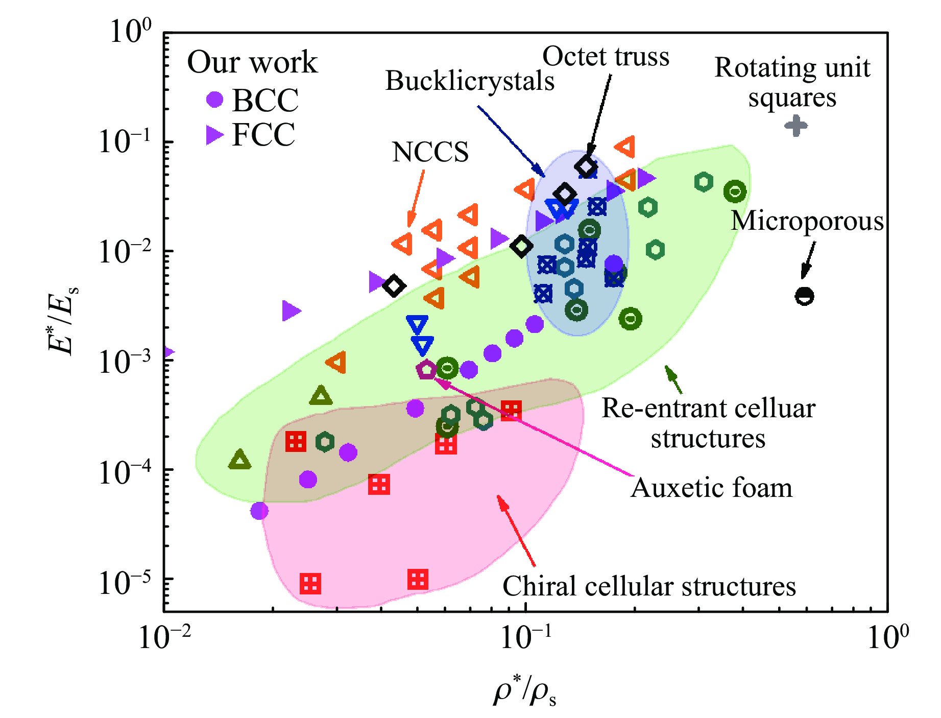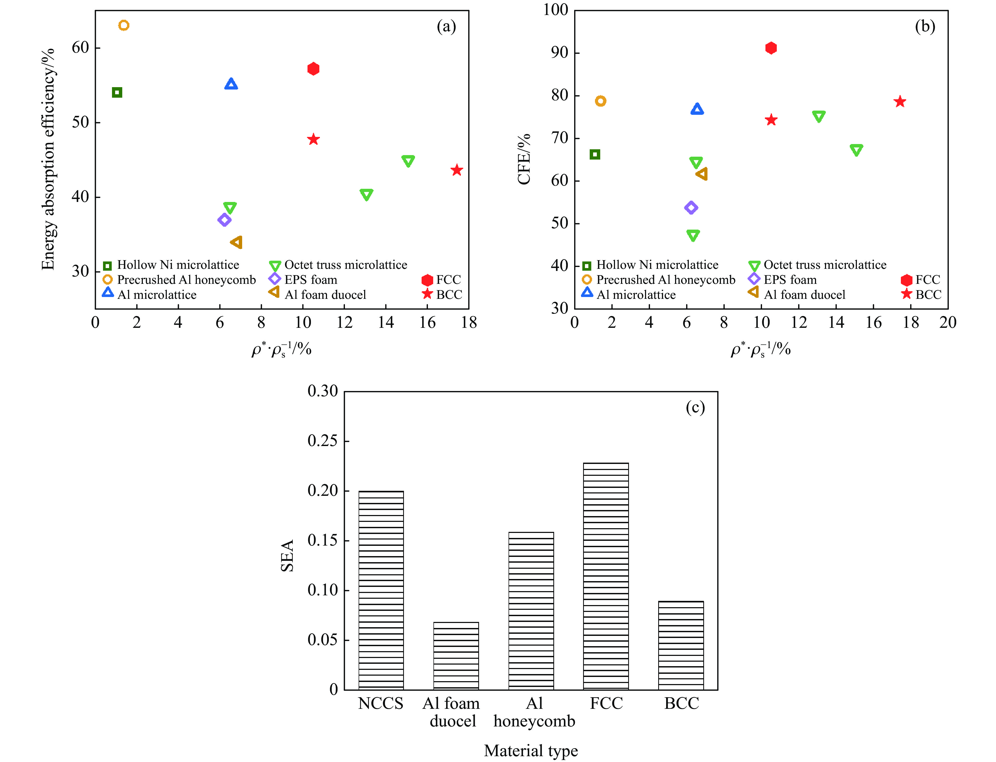 基于金属微观晶体结构,设计了一种改进型面心立方(FCC)晶格材料。利用 ABAQUS有限元软件,对体心立方(BCC)及FCC晶格材料进行了准静态与速度为10~100 m/s的动态加载数值模拟,定量分析了两种晶格材料的能量吸收性能,给出了动态加载下晶格材料压缩平台应力及塑性能量耗散的半经验公式。结果表明:在准静态压缩载荷下,相同相对密度的FCC晶格比BCC晶格具有更优异的能量吸收性能,当相对密度为10.5%~10.6%时,FCC晶格材料的归一化比吸能是BCC晶格材料的2.6倍。此外,与常见负泊松比材料及大部分桁架晶格材料相比,相同相对密度的FCC晶格材料具有更高的比刚度、能量吸收效率及压缩力效率。