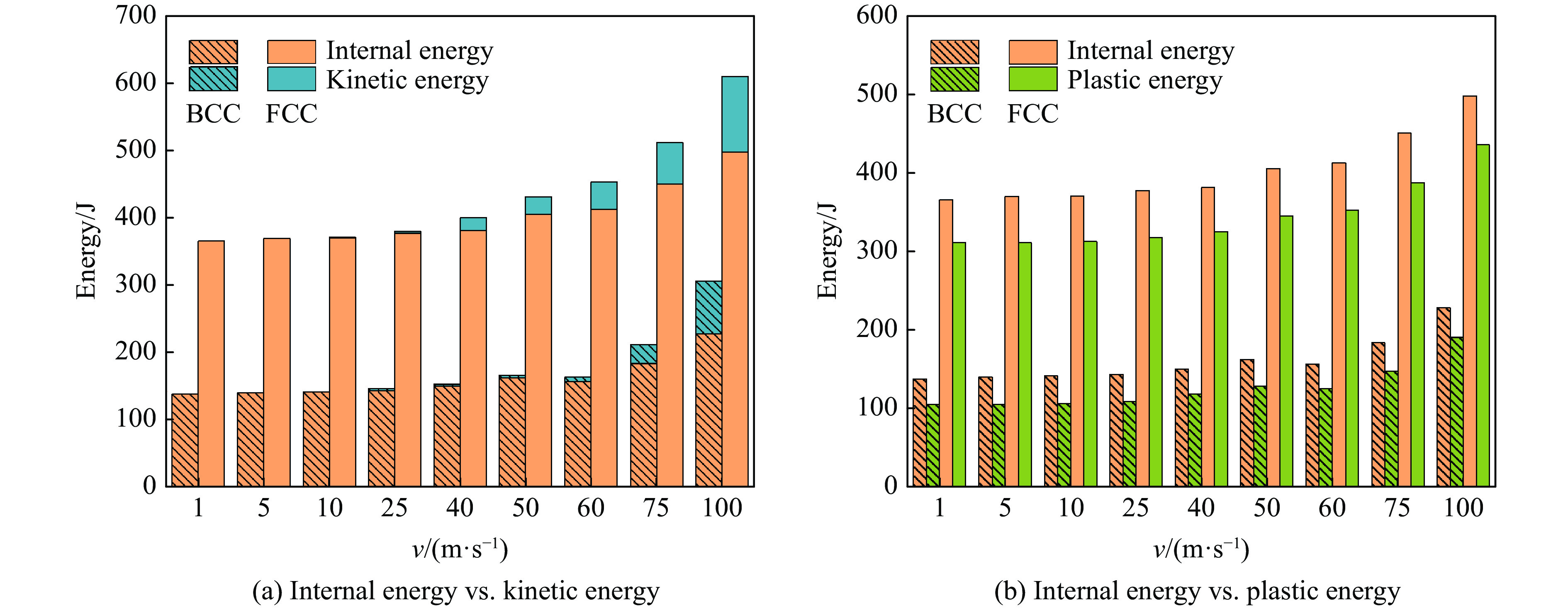 氦泡等缺陷对金属材料动态强度的影响一直是动态强度研究关注的重点。将相场方法引入冲击加载下氦泡演化行为研究中,通过与晶体塑性理论耦合,建立了可描述冲击下氦泡早期演化行为的介观模拟技术。应用该方法,针对含氦泡的金属铝材料,从介观尺度对氦泡的演化行为及其对位错集体演化行为的影响进行了研究。结果表明:氦泡结构的非均匀性导致局域应力集中和塑性变形集中,局域塑性变形集中会导致沿冲击波传播方向发射稀疏波;从能量守恒角度上看,在材料变形过程中氦泡生长与塑性变形呈竞争关系,塑性耗散的快慢直接影响氦泡的生长速率,使其发生改变。研究结果可为解读含氦泡材料的宏观屈服强度和层裂行为提供理论支撑。