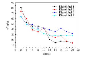 Diesel fuel samples Component Tf/(℃) ρ/(kg/m3) μ(20℃)/(μm-2·s-1) α(20℃)/[g/(m·s)] σ(20℃)/(mN/m) Diesel fuel 1 -10 diesel fuel 84 794.1 3.934 3.124 31.64 Diesel fuel 2 Emulsified diesel fuel with 5% water content 87 821.9 6.477 5.323 32.53 Diesel fuel 3 Emulsified diesel fuel with 5% water content and 0.2% explosion suppressant 91 823.5 12.011 9.891 32.11 Diesel fuel 4 Emulsified diesel fuel with 5% water content and 0.4% explosion suppressant 93 827.4 22.240 18.401 33.48 表 2 激波参数