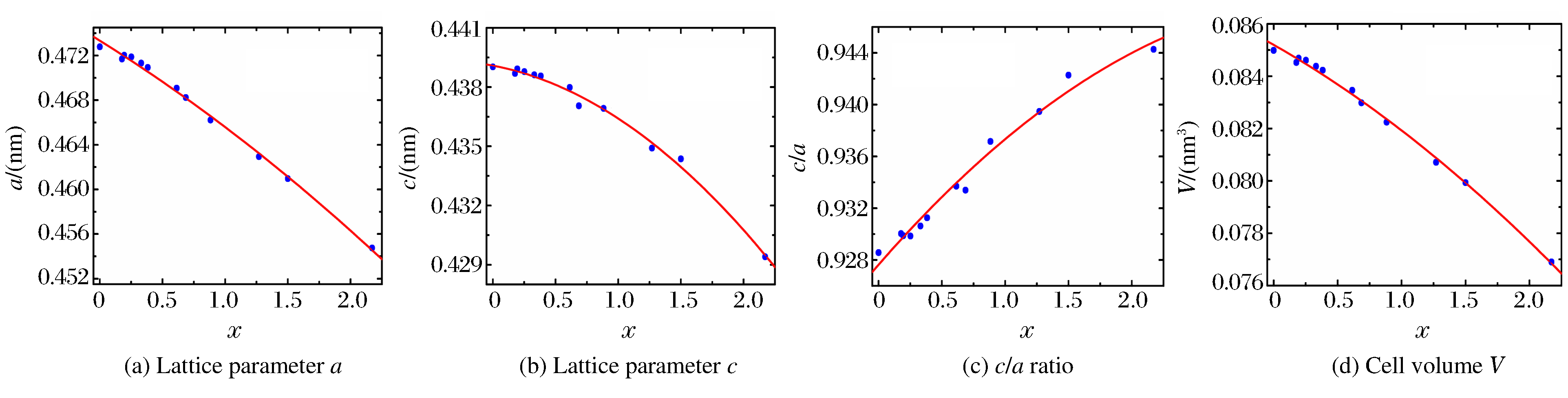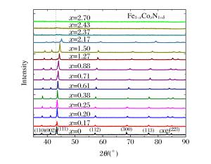 Iron-based nitrides a/(nm) c/(nm) V/(nm3) ε-Fe3N1.27 0.47413(5) 0.43993(5) 0.085645(34) ε-Fe2.67Co0.33N0.99 0.47132(3) 0.43862(7) 0.084380(34) ε-Fe2.32Co0.68N0.98 0.46824(9) 0.43705(14) 0.082988(74) ε-Fe2.67Ni0.33N0.86 0.47004(4) 0.43846(5) 0.083893(29) ε-Fe2.29Ni0.71N0.79 0.47380(4) 0.43853(6) 0.085257(34) -