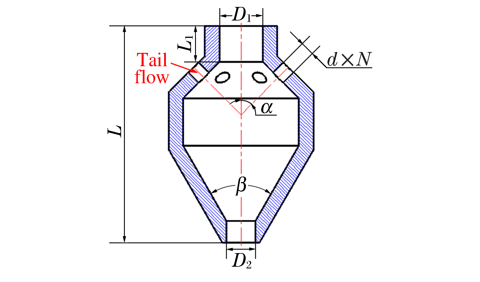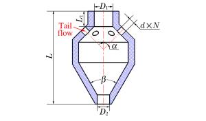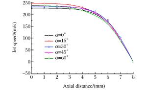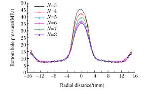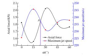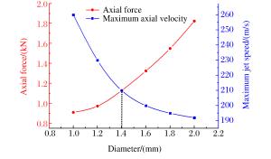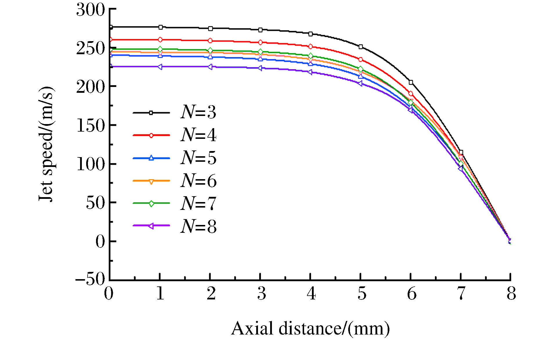 Scheme N d/(mm) α/(°) 1 3 2.0 0 2 4 2.0 0 3 5 2.0 0 4 6 2.0 0 5 7 2.0 0 6 8 2.0 0 7 6 2.0 15 8 6 2.0 30 9 6 2.0 45 10 6 2.0 60 11 6 1.0 15 12 6 1.2 15 13 6 1.4 15 14 6 1.6 15 15 6 1.8 15 表 3 喷嘴轴向推进力
