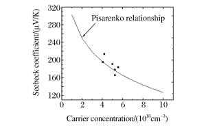 表 1 高压合成PbTe1+x的霍尔系数、载流子浓度(n)、载流子迁移率(u)和载流子有效质量(m*)