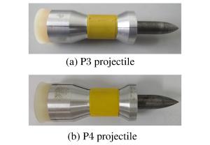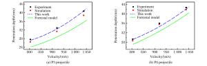 Projectile Velocity/(m/s) Crater depth/(mm) Crater size/(cm2) P3 1039 38.9 15.0×18.0 P3 925 31.4 13.5×16.3 P3 805 27.5 11.5×14.5 P4 1038 41.8 17.8×19.1 P4 920 35.2 15.5×18.0 P4 803 28.7 13.0×16.0 -
