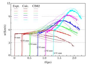摘要: 利用特征线法、简化的状态方程、炸药冲击阻抗与声阻抗的关系,可以得到凝聚炸药冲击起爆前期反应流场的解析模型(CIM2)。选择具有单一形式、带耗散项的反应速率函数,进而计算出不同深度炸药的粒子速度剖面。通过对不同深度反应速率的重新假设,改进了CIM2模型,并将其应用于PBX 9501炸药。结果表明,改进模型减缓了CIM2模型中的能量输送现象,从而能够更准确地计算冲击波阵面粒子速度、峰值粒子速度、峰值到达时间和粒子速度曲线形状。Abstract: In this work we obtained an analytic model CIM2 for the flow field of the reaction zone of condensed explosives in early-stage shock initiation using the characteristic line, the simplified equation of state and the simplified relationship between the material impedance and the shock impedance.By choosing a single form of the reaction rate with the dissipative term, we calculated the particle velocity at different depths of condensed explosives.The CIM2 model was improved by the new hypothesis of the reaction rates at different depths, and was applied to the calculation of PBX 9501.The results show that the improvement of CIM2 can slow down the energy transport after the shock, and that the improved CIM2 can give a more exact calculation of the particle velocity of the shock and crest, the time at which the crest arrives, and the curve of the particle velocity.