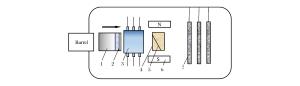 Figure  1.  Experimental set-up (1.Sabot; 2.Flyer; 3.Velocity measured ring; 4.Explosive sample; 5.EMV gauge; 6.Permanent magnet; 7.Target buffer)