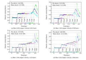 Figure  5.  Particle velocity versus time under different impact velocities (5, 6, …, 12 mm refer to the effective length of Al wire corresponding to each particle velocity curve in the EMV gauge, and the pressures of pre-shock and main shock are specified in Section 3.2)