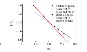 Figure  8.  Pop plot showing the time to detonation tD-C (μs)versus the initial shock pressure p (GPa) for double shocks and sustained pulse