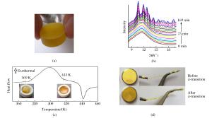 Figure 2. Bulk amorphous sulfur prepared by rapid compression[22-22, 25]((a) Picture of bulk amorphous sulfur; (b) WAXS patterns of amorphous sulfur taken at room temperature with time interval 10 min; (c) DSC profile of amorphous sulfur, which shows an abnormal exothermic melting phenomenon; (The photos of sample at 369 and 413 K are inserted.) (d) Preparation of two kinds of amorphous sulfur from liquid sulfur before and after λ transition.)