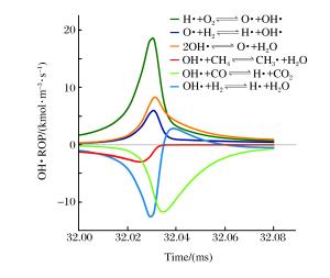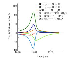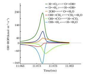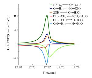 Elementary reaction Maximum reaction rate/(kmol·m-3·s-1) Scheme 1 Scheme 2 Scheme 3 Scheme 4 Scheme 5 O·+H2$\rightleftharpoons $H·+OH· 90.929 36.751 10.328 29.536 6.058 O·+CH3·$\rightleftharpoons $H·+CH2O 33.959 13.633 3.608 11.462 2.430 H·+O2$\rightleftharpoons $O·+OH· 233.232 93.227 25.150 82.215 18.646 H·+CH4$\rightleftharpoons $CH3·+H2 39.482 15.471 4.189 13.453 2.954 H·+CH2O$\rightleftharpoons $HCO·+H2 40.330 15.368 3.881 13.380 2.841 OH·+H2$\rightleftharpoons $H·+H2O 155.618 68.829 20.413 55.081 12.407 OH·+CH4$\rightleftharpoons $CH3·+H2O 27.586 10.600 2.749 10.841 2.960 OH·+CO$\rightleftharpoons $H·+CO2 79.483 33.882 10.016 36.581 11.732 -