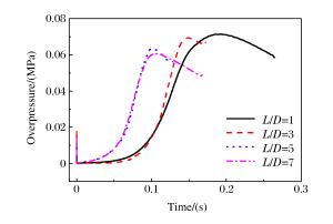图  10  长径比为1、3、5和7时罐内超压对比(C3H8宏观体积比2.1%)