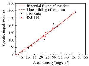 Test No. Mass of explosive/(g) Areal density/ (mg/cm2) Velocity of target/(m/s) Mass of target after explosion/(g) Specific impulse/ (Pa·s)