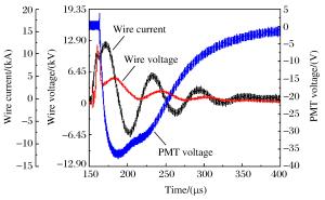 图  钨丝上脉冲电流、电压和产生的光脉冲波形