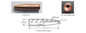 摘要: 为提高子弹的低侵彻性,研究了一种空心开花型低侵彻弹。通过进行空心开花型低侵彻弹侵彻水介质的实验,研究了弹体头部在不同速度下的变形情况;利用LS-DYNA软件对开花弹入水过程进行数值模拟,得到子弹在不同入射速度下的速度衰减曲线和位移曲线。研究结果表明:开花弹入水过程中的头部开裂程度与速度有关,速度越高,弹头变形越大;弹头开裂成“花瓣状”可以有效降低子弹速度,增大侵彻阻力;开花弹高速侵彻下的位移小于低速下的位移,说明开花弹具有良好的低侵彻特性。Abstract: In order to reduce the bullet destruction, the design of shrapnel, a new type of bullet based on the standard small bore bullet, is proposed.We performed the experiment of water penetration of the shrapnel to study the deformation of the projectile head at different speeds, and conducted the corresponding numerical simulation using LS-DYNA and obtained the projectile's velocity attenuation and displacement curve.The results show that the degree of deformation of the projectile's head is related to its speed, the higher the speed, the greater the warhead deformation.The warhead cracking into "petals" can effectively reduce the bullet velocity, and raise the penetration resistance.The displacement in high speed penetration is less than that in low speed penetration, which indicates that the shrapnel has a good low-penetrating characteristic.