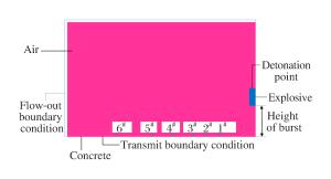 摘要: 为研究含铝炸药近地空中爆炸的三波点特性,利用ANSYS/AUTODYN显式有限元程序,对3种RDX基含铝炸药HL-01(RDXph)、HL-02(85% RDXph+15% Al)和HL-03(70% RDXph+30% Al)空中爆炸过程进行了模拟。结果表明:计算得到的压力时程曲线与实测压力时程曲线较吻合,且在不同位置处的超压值也接近实验值,说明所建立的模型及状态方程参数选取合理;与经验图表法的对比说明,基于爆热当量的经验图表法不适用于含铝炸药三波点高度的计算,而用数值模拟方法可以较好地获得含铝炸药的三波点高度;同一爆炸高度下,3种炸药的三波点高度由大到小依次为HL-03、HL-02、HL-01;对于同种炸药,三波点高度随着爆炸高度的减小而增加。Abstract: To identify the properties of the three-wave point for aluminized explosives in the near-earth air blast, we simulated the explosion process of 3 kinds of RDX-based aluminized explosives, i.e. HL-01 (RDXph), HL-02 (85% RDXph+15% Al) and HL-03 (70% RDXph+30% Al), using the ANSYS/AUTODYN software.The results show that the pressure histories and the near-earth overpressures obtained from the simulation almost overlapped those measured from the experiment, indicating that the chosen model and parameters were appropriate.The comparison of the simulation results with those from the empirical chart shows that it was not suitable to calculate the height of three-wave point for aluminized explosives from the empirical chart, while it was so by simulation.At the same explosion height, the height sequence of three-wave point was HL-03 > HL-02 > HL-01.For the same explosive, the height of three-wave point increased with the decrease of the explosion height.