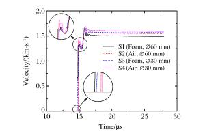 Probe Location of test point t0/μs v1/(m·s-1) v2/(m·s-1) S1 Foam cushion, Ø60 mm 13.619 1 640 2 277 S2 Air clearance, Ø60 mm 13.589 1 447 2 303 S3 Foam cushion, Ø30 mm 13.631 1 679 2 434 S4 Air clearance, Ø30 mm 13.605 1 510 2 450 表 2 炸药爆轰驱动双层飞片实验结果
