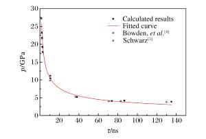 df/μm Material vf/(km·s-1) p/GPa δ1/% τ/ns δ2/% Calc. Ref. Calc. Ref. 25.0 Kapton 2.84[5] 10.43 9.8[5] 6.43 10.80 10.3[5] 4.85 76.0 Kapton 1.84[5] 5.22 5.3[5] 1.51 38.00 36.3[5] 4.68 140.0 Kapton 1.51[5] 4.09 4.0[5] 2.25 73.80 70.8[5] 4.24 165.0 Kapton 1.53[5] 4.16 4.1[5] 1.46 86.70 83.1[5] 4.33 254.0 Kapton 1.46[5] 3.90 3.8[5] 2.63 135.00 130.0[5] 3.85 3.0 Al 3.66[4] 27.27 27.1[4] 0.63 1.61 1.6[4] 0.62 3.5 Al 3.30[4] 23.25 23.1[4] 0.65 1.96 1.9[4] 3.16 4.0 Al 3.16[4] 21.76 21.6[4] 0.74 2.28 2.2[4] 3.64 4.5 Al 2.92[4] 19.29 19.1[4] 0.99 2.64 2.6[4] 1.54 5.0 Al 2.77[4] 17.81 17.7[4] 0.62 2.99 2.9[4] 3.10 25.0 Kapton 2.96[4] 11.12 11.1[4] 0.18 10.70 10.7[4] 0 表 3 铜叠氮化物爆炸驱动飞片起爆HNS-Ⅳ炸药的模拟结果