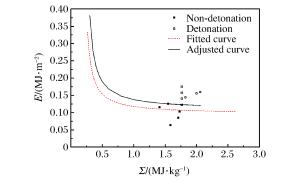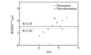 Explosive size/(mm×mm) vf/(km·s-1) p/GPa τ/ns u/(km·s-1) p2.08τ/(GPa2.08·μs) $ \frac{{0.1900}}{\mathit\Sigma } + \frac{{0.0954}}{E}$ Simulation results ∅0.8×0.3 2.29 15.70 4.381 1.68 1.35 0.960 Non-detonation ∅0.8×0.4 2.43 17.16 4.155 1.76 1.54 0.883 Non-detonation ∅0.8×0.5 2.62 19.23 3.881 1.88 1.82 0.787 Detonation ∅0.8×0.6 2.67 19.79 3.815 1.91 1.90 0.766 Detonation ∅0.8×0.7 2.82 21.50 3.628 2.00 2.14 0.707 Detonation ∅0.8×0.8 2.86 21.96 3.581 2.03 2.21 0.690 Detonation ∅0.4×0.5 2.45 17.38 2.062 1.78 0.78 1.620 Non-detonation ∅0.5×0.5 2.56 18.57 2.477 1.85 1.08 1.230 Non-detonation ∅0.6×0.5 2.58 18.79 2.952 1.86 1.32 1.030 Non-detonation ∅0.7×0.5 2.61 19.12 3.408 1.88 1.58 0.886 Detonation ∅0.9×0.5 2.61 19.12 4.381 1.88 2.03 0.713 Detonation ∅1.0×0.5 2.61 19.12 4.868 1.88 2.25 0.653 Detonation -