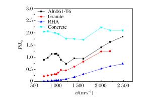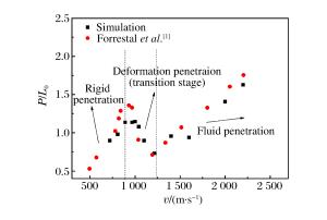 G/MPa Y/MPa β n Gp GT/(MPa·K-1) Yp T/K 2 760 680 125 0.1 1.8 -17 0.018 1 220 HRC A/MPa B/MPa n C D1 D2 D3 D4 31 745 623.11 0.424 0.061 0.351 1.650 2.589 0.020 36 814 643.57 0.446 0.055 0.348 2.673 4.333 0.012 45 1 269 810.18 0.479 0.040 0.239 8.593 7.867 0.009 55 1 516 1 537.97 0.610 0.017 0.014 0.015 3.251 0.007 表 4 不同硬度条件下侵彻转变阶段的弹体速度范围
