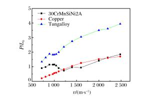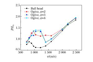 Head shape R/mm L0/mm d/mm ρ/(g·cm-3) m/g Ball 3.5 71.00 3.5 7.83 21 Ogive, φ=2 14.2 73.26 3.5 7.83 21 Ogive, φ=3 21.3 73.61 3.5 7.83 21 Ogive, φ=4 28.4 74.56 3.5 7.83 21 表 6 弹体材料参数