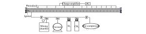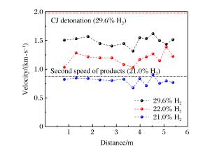 摘要: 在内径48 mm、长度5 800 mm的含环形障碍物圆管内,进行了氢气-空气及氢气-甲烷-空气的爆轰波传播试验研究,确定了爆燃转爆轰(Deflagration-to-Detonation Transition,DDT)极限。环形障碍物阻塞比为0.56,间距分为两种,即S=D和S=2D,其中S为障碍物间距,D为管道内径。火焰的速度由安装在管道壁面上的光电二极管采集得到。试验测量得到的火焰为准爆轰或阻塞火焰。在S=2D情况下得到的火焰速度均比S=D情况下的火焰速度高,并且靠近DDT极限时速度波动更明显,表明在间距较大的情况下爆轰的重起爆循环周期更长,类似于"弛振爆轰"。对于氢气-空气,障碍物间距为D时在DDT极限处有d/λ>1(富氧条件下d/λ=1.6,贫氧条件下d/λ=1.4),间距为2D时更容易形成爆轰的重起爆,在DDT极限处与准则d/λ≈1一致;对于氢气-甲烷-空气,甲烷的添加使爆轰更不稳定,对于两种间距的障碍物得到的DDT极限均有d/λ≈1(d和λ分别为障碍物内径和爆轰胞格尺寸)。说明障碍物间距对爆轰波传播有显著的影响,即间距的增大更有利于爆轰波的传播。为形成准爆轰,障碍物内径必须至少可以容纳一个爆轰胞格,同时障碍物间距足够大从而引起爆轰的重起爆。Abstract: In this study experiments were carried out in a round tube, 5 800 mm in length and 48 mm in inner-diameter, filled with orifice plates, to investigate the detonation of hydrogen-air mixtures and stoichiometric hydrogen-methane-air mixtures, and the DDT (Deflagration-to-Detonation Transition) limits were determined.The blockage ratio of the orifice plates was 0.56, and the spacing was divided into two, i.e., S=D and S=2D, in which S and D are the obstacle spacing and the tube diameter.The flame velocity was obtained using photodiodes mounted on the tube wall.The results show that the flame regime observed is the quasi-detonation or the choked flame.The flame velocity measured for S=2D is larger than that for S=D, and the velocity fluctuation is more significant.This indicates that the cycle of the detonation failure and re-initiation is longer for S=2D, which is similar to the "galloping detonation".For hydrogen-air mixtures, detonation re-initiation occurs more aptly at S=2D, and the limits correlate well with d/λ≈1.In the case of hydrogen-methane-air mixtures, the DDT limits for S=D and S=2D are both consistent with d/λ≈1, where d and λ are the inner diameter of the orifice plate and the detonation cell size.The results indicate that the obstacle spacing has a significant effect on the propagation of detonation, i.e., detonation propagates more aptly for increased spacing.To generate the quasi-detonation, the opening of the orifice plate has to be large enough to contain at least one cell size while the spacing has to be large enough to form detonation re-initiation.
