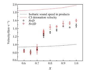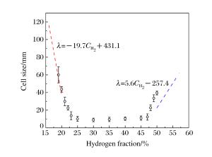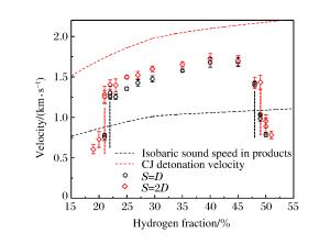 Obstacle spacing Lean limit/% φ d/λ L/λ Rich limit/% φ d/λ L/λ D 22 0.67 1.6 7.0 48 2.20 1.4 6.4 2D 21 0.63 1.1 7.2 49 2.29 1.0 6.6 表 2 化学计量比下氢气-甲烷-空气的DDT极限