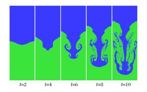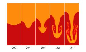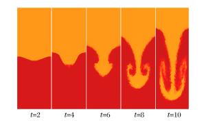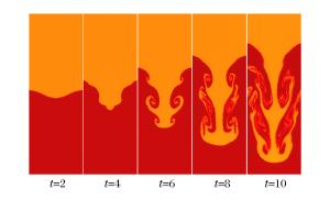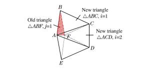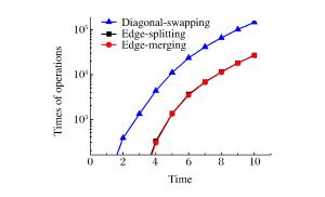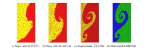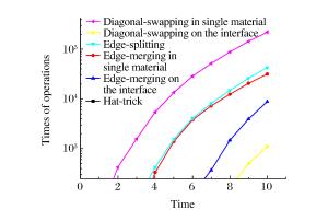 摘要: 在用拉格朗日方法模拟二维多介质可压缩流体的运动时,网格发生大变形往往是模拟不能正常进行下去的重要原因。网格动态局域重分可以有效改善网格的畸变程度,使计算得以持续。针对三角形计算网格提出了一种新的动态局域重分方法,包含"对角线交换""长边劈裂""短边融合"和"帽子戏法"4种基本操作,其中前3种操作不仅作用于同种介质内部,还可将其拓展到多介质界面处,与"帽子戏法"一起处理界面附近的大变形网格。在网格动态局域重分后,将旧网格上的物理量映射到新网格上,先计算出新三角形的质量和内能,再根据动量守恒和能量守恒对新三角形的格点速度及内能进行修正。利用该方法对冲击波与气泡相互作用和R-T不稳定性问题进行了数值模拟,取得了良好的效果。在R-T不稳定性算例中,采用同种介质和不同介质两种模型进行对比,模拟结果验证了该方法的有效性。Abstract: When simulating the two-dimensional multi-material compressible flows using the Lagrangian method, the distortion of the mesh is often the reason why the process terminates.The dynamic local remeshing is an option to relax the distortion.In this study, we combined the "diagonal-swapping" "edge-splitting" "edge-merging" and "hat-trick" to deal with the distortive mesh.The 4 operations could act not only in single material, but also be extended to the multi-material interface to deal with the distortive mesh on the interface.After the remeshing, the quantities on the old mesh are projected onto the new one.During this process, the mass, momentum and energy are kept conservative.We verified the effectiveness and accuracy of this method by using it to simulate the shock/bubble interaction and the R-T instability.In the R-T instability simulation, the single material and the multi-material models are applied to prove that this method is able to deal with the distortive mesh both inside the material and on the interface.