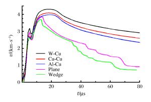 Liner type v/(m·s-1) t/μs Head Tail W-Cu 4439 1130 44 Cu-Cu 4173 924 36 Al-Cu 3904 887 34 Plane 3716 735 19 Wedge 3525 612 17 -