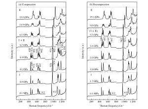 图 2 加压和卸压过程中NaClO4的代表性拉曼光谱(图 2(a)显示加压过程,其中4.1GPa曲线指示NaClO4开始相变;图 2(b)表示卸压过程,3.5GPa曲线表示相变开始。箭头及对应数字指示相变过程中出现的新峰。Ⅰ和Ⅱ分别代表硬石膏相和独居石相,Ⅰ+Ⅱ和(Ⅰ+Ⅱ)分别代表加压和卸压过程中两相共存。ν2、ν3和ν4振动区间纵坐标放大1倍)
