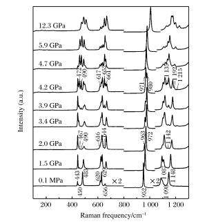 (cm-1·GPa-1)Internal vibrationalmodes Symmetryclassification ω/cm-1(p=7.0GPa) (dω/dp)/(cm-1·GPa-1) ν2 B2g 446 0.5(2) ν2 Bg 465 2.2(1) Ag 496 4.1(2) Ag 480 2.4(0) ν4 B1g 625 1.5(1) Ag 497 2.4(1) B3g 635 2.0(2) Bg 510 2.6(1) Ag 668 3.3(4) ν4 Ag 619 0.8(1) ν1 Ag 974 6.8(3) Bg 631 1.4(1) ν3 B1g 1102 3.9(1) Ag 643 1.8(1) Ag 1116 5.3(1) Bg 659 2.3(1) B3g 1174 7.8(7) Ag 667 1.8(1) ν1 Ag 986 4.7(1) ν3 Ag 1113 3.9(1) Ag 1132 4.1(1) Ag 1148 4.3(1) Bg 1160 3.9(1) Bg 1172 5.0(1) Bg 1208 5.3(2) Note:Numbers in parentheses indicate standard deviation. -