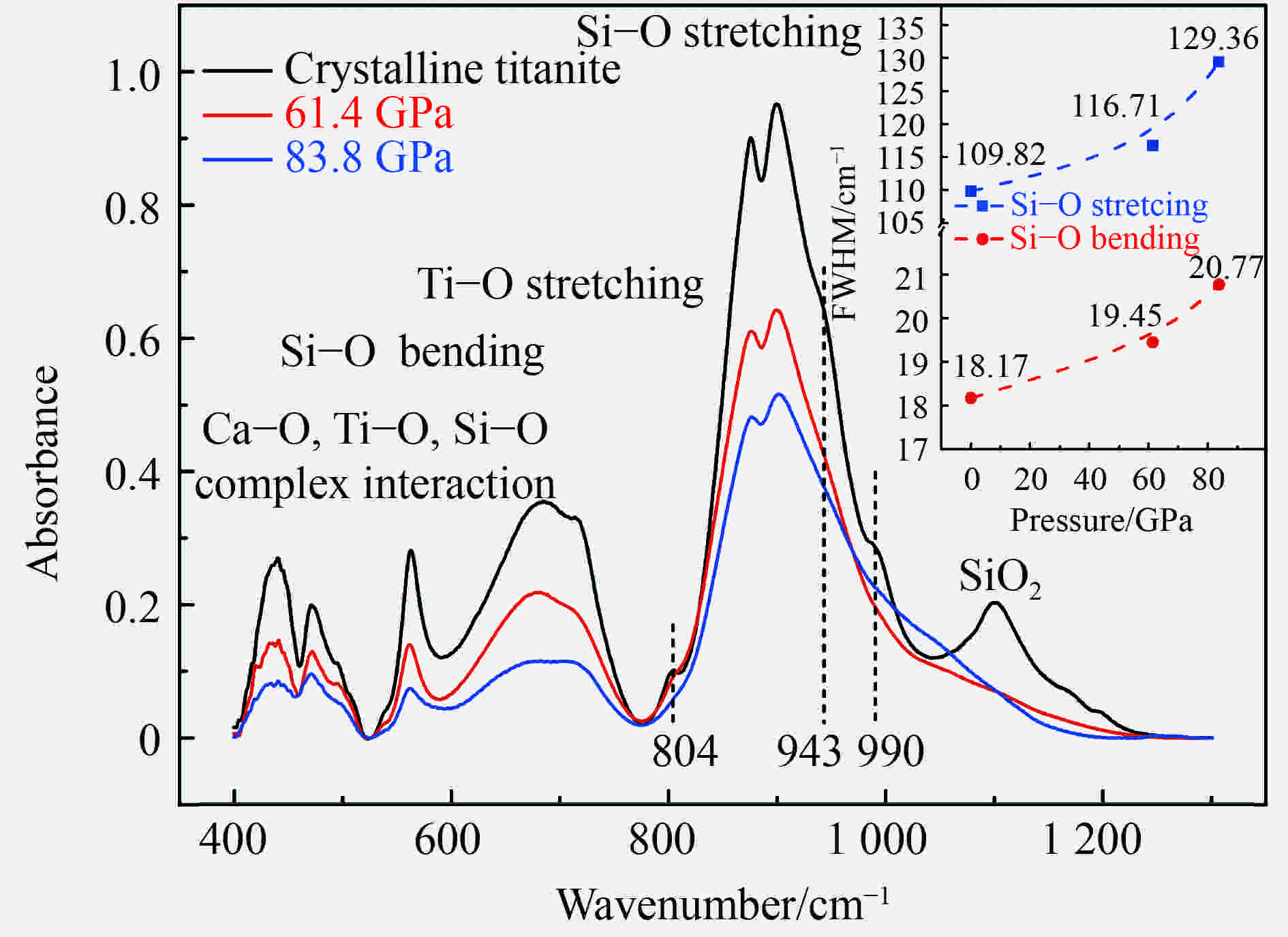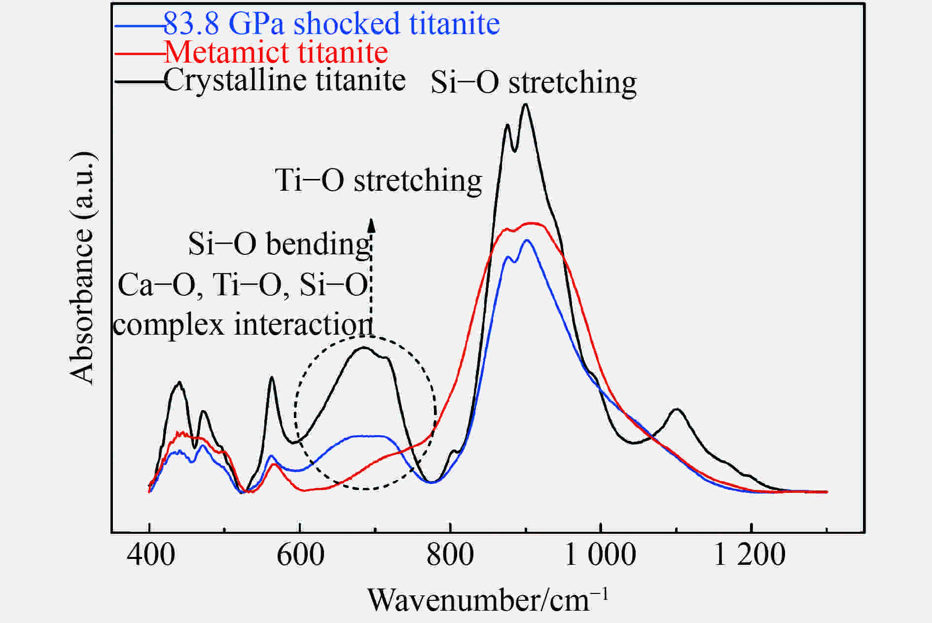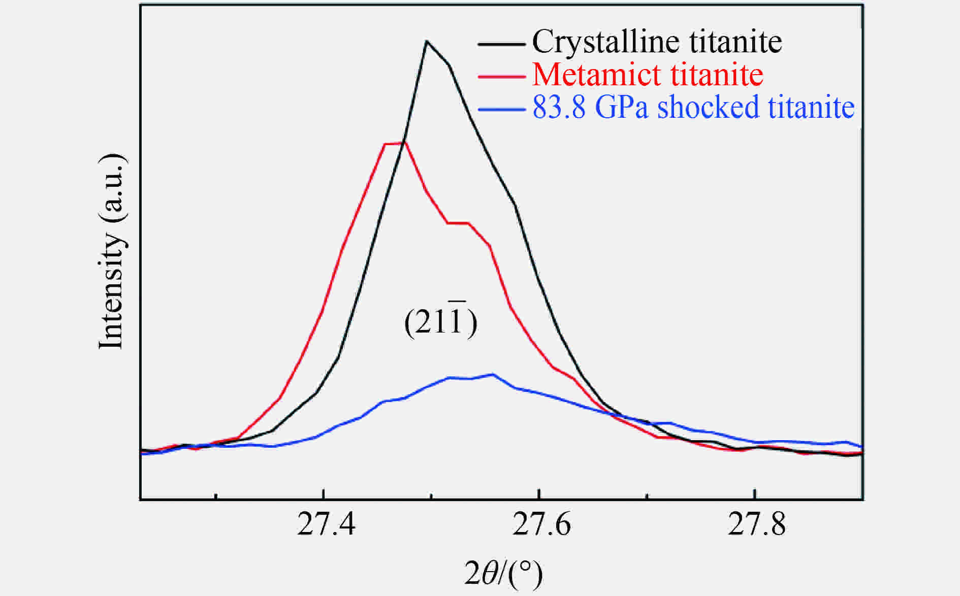 摘要: 高压和辐照这两种极端条件会造成晶体材料的晶体结构发生改变或损伤。以榍石(CaTiSiO5)为研究对象,利用冲击高压和样品回收技术,探索冲击高压作用后结构的变化规律,并与辐照造成的损伤榍石作对比研究,认识冲击高压与辐照造成榍石结构损伤的异同。研究表明:冲击高压作用下,晶态的榍石出现结构损伤和非晶化,出现类似于榍石的辐照损伤现象,但具体过程和受损的晶体结构有明显不同。具体表现为:X射线衍射、红外和拉曼光谱的特征峰强度减弱,谱线变宽,细节丢失;冲击高压导致晶态榍石拉曼光谱的Ti–O伸缩振动主峰出现红移,与辐照损伤蜕晶化过程出现的蓝移相反。此外,晶胞参数a、b、c和晶胞体积V减小,与辐照损伤过程相反。Abstract: High pressure shock and α-decay radiation are two extreme conditions capable of leading to damages on crystal lattices of solid materials. The present work investigated the influence of shocking on the structural variations of titanite (CaTiSiO5) using a gas gun shock-wave technology. The results were used to compare the similarities and differences in spectral and structural changes between shocked and α-decay radiation damaged titanite, as α-decay radiation process was considered as involved in a fast high pressure process. The results showed that high pressure shock and α-decay radiation can both produce defective crystal lattice and even amorphous phases in titanite, resulting in a decrease in band intensity, a line boarding and a loss of spectral details in X-ray diffraction patterns, infrared and Raman spectra. However, there are distinct differences in the detailed processes and damage mechanisms between the two processes. High-pressure shock causes the main peak of the Ti-O stretching vibration in titanite shifts to a lower frequency, which is opposite to its behaviour in radiation damaged samples. Furthermore, shocking leads to a reduction of unit cell parameters a, b, c and cell volume V, quite contrary to a unit-cell swelling caused by radiation damage.