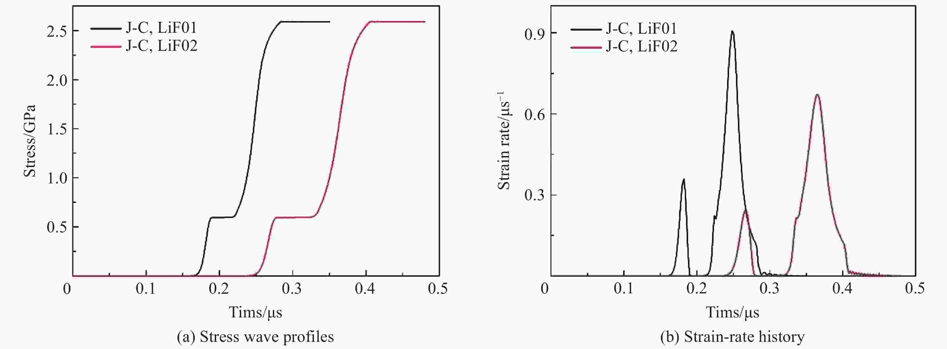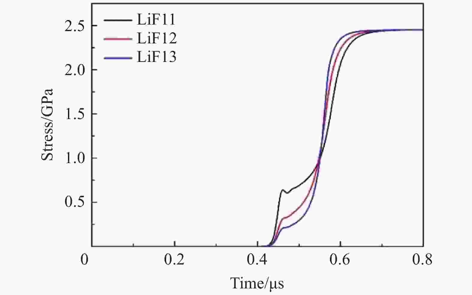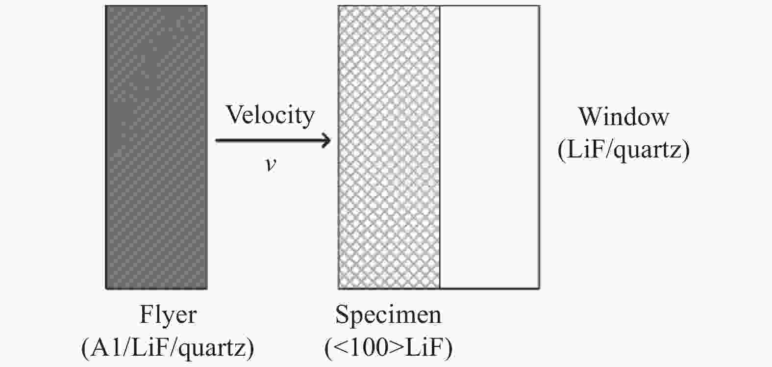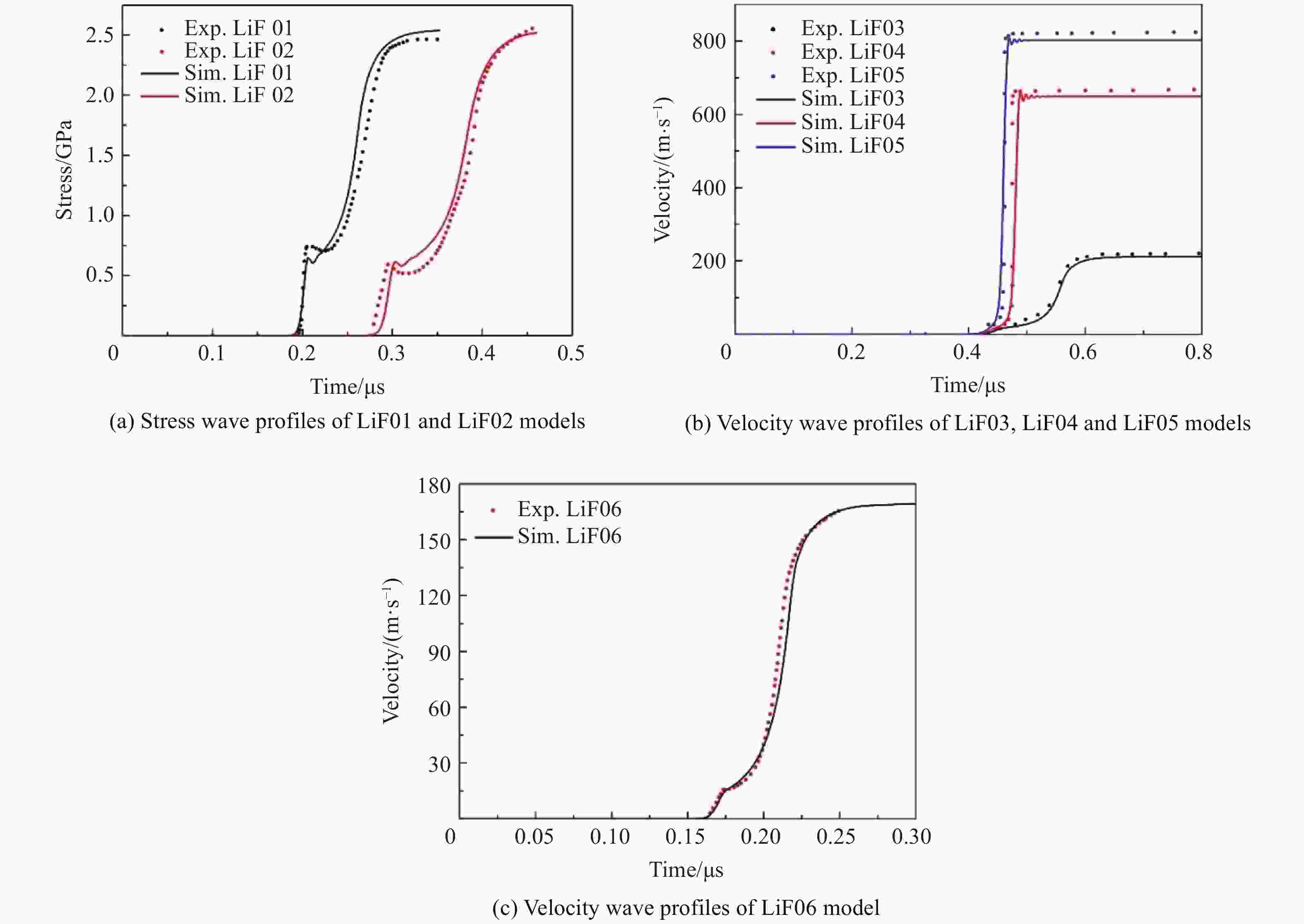 Sample No. Flyer material Window material v/(m·s–1) Sample’s thickness/mm Ref. LiF01 Al Quartz 340.0 1.35 [6] LiF02 Al Quartz 340.0 1.98 [6] LiF03 LiF LiF 423.8 3.0 [17] LiF04 LiF LiF 1 321.6 3.0 [17] LiF05 LiF LiF 1 641.5 3.0 [17] LiF06 Fused sillica Fused sillica 340.9 1.143 [18] LiF11, LiF12, LiF13 LiF LiF 340.0 3.0 Note: LiF01–LiF06 models were built based on the parameters of specimens and experiments in references, while LiF11–