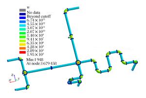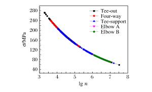 Component v0/(m·s-1) Mapping force/N x y z Elbow A 3 1.86 124.00 -147.94 5 282.56 39.96 -332.05 7 561.72 142.27 -707.51 10 5 677.60 -2 269.10 -797.02 Elbow B 3 -0.32 -44.00 2.26 5 865.42 -1 068.40 0.24 7 1 745.20 -2 095.90 -9.68 10 18 628.00 -18 369.00 580.01 Tee-support 3 136.32 -0.23 -3.15 5 682.44 0.04 -3.56 7 1 093.30 -1.14 -0.15 10 2 715.60 -6.83 -32.04 Tee-out 3 472.57 -0.01 343.97 5 1 707.60 -0.65 1 092.30 7 3 031.30 -0.24 2 002.40 10 13 840.00 -20.37 9 474.50 Four-way 3 -8.02 0.25 -186.31 5 -7.74 1.70 -615.87 7 -19.67 3.66 -1 173.30 10 126.58 13.93 -2 455.70 表 2 计算结果