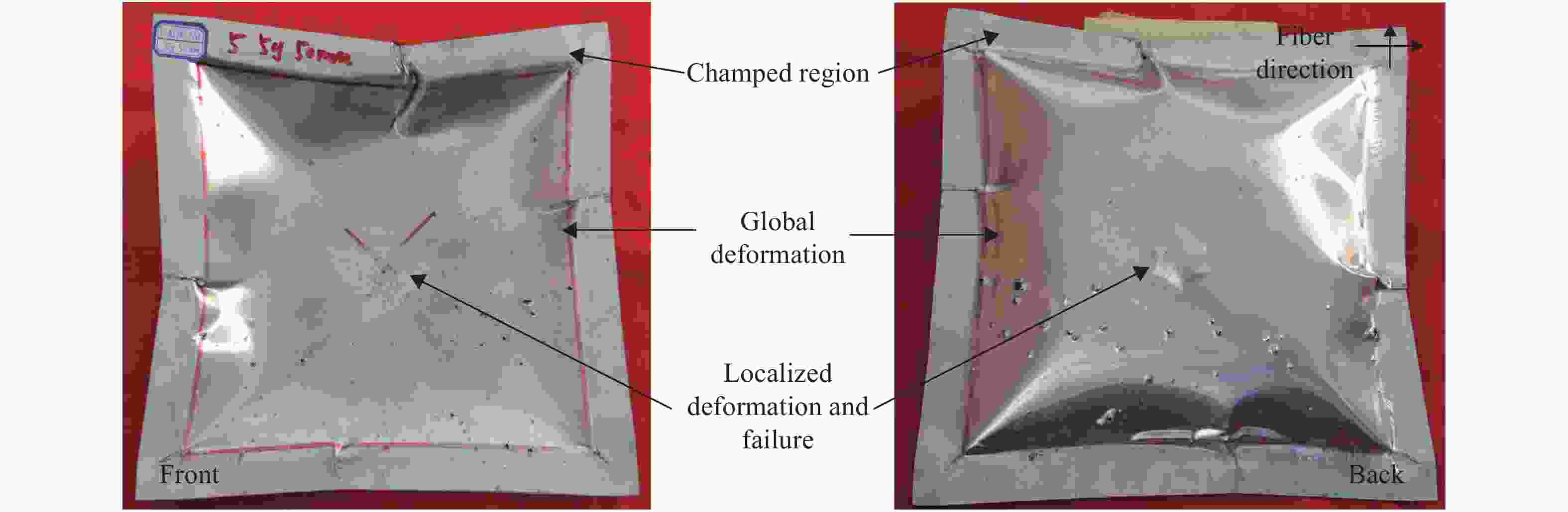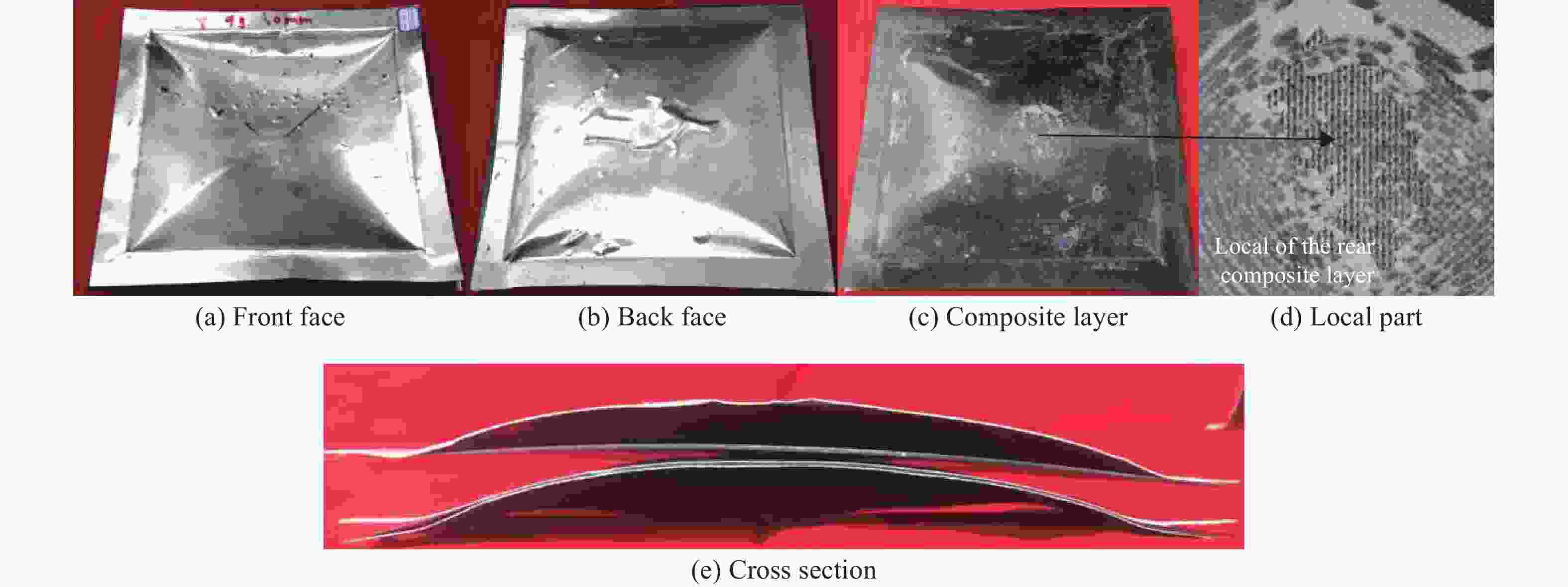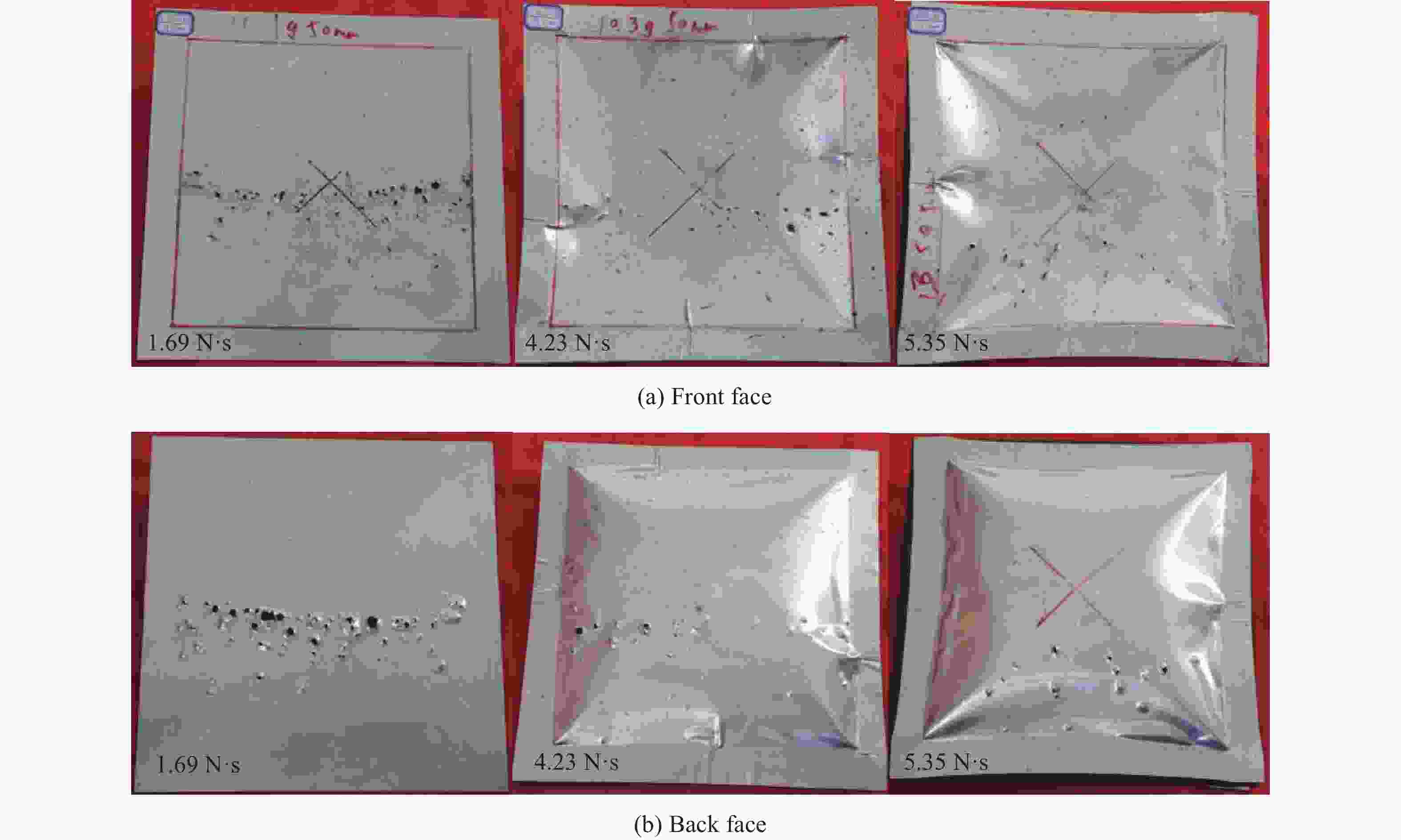 摘要: 采用爆炸冲击摆锤系统,对玄武岩纤维-铝合金层合板和碳纤维-铝合金层合板进行了爆炸加载实验。实验中通过改变炸药质量获得不同的加载冲量,分析了载荷冲量、结构组合形式以及纤维类型对纤维金属层合板变形/失效模式的影响。实验中观察到分层、基质失效、金属撕裂、塑性大变形等典型的变形失效模式。实验结果表明:随着冲量的增加,纤维金属层合板中铝合金层的塑性变形以及纤维层的损伤区域不断增大;纤维金属层合板相对于单一的金属层合板具有更优异的抗冲击性能。Abstract: In this work we performed blast loading tests on basalt fiber-aluminum alloy laminates and carbon fiber-aluminum alloy laminate using an explosion impact pendulum system and obtained different loading impulses by changing the quality of the explosive, thereby analyzing the influences of load impulse, structure combination and fiber type on the deformation/failure mode of fiber metal laminates and revealing the laminates’ typical failure modes such as delamination, matrix failure, metal tear and plastic deformation. The experimental results showed that the plastic deformations of the aluminum alloy layer in the fiber metal laminate and the damage area of the fiber layer increase with the increase of the impulse, and the fiber metal laminates have better impact resistance than that of the single metal laminate.
