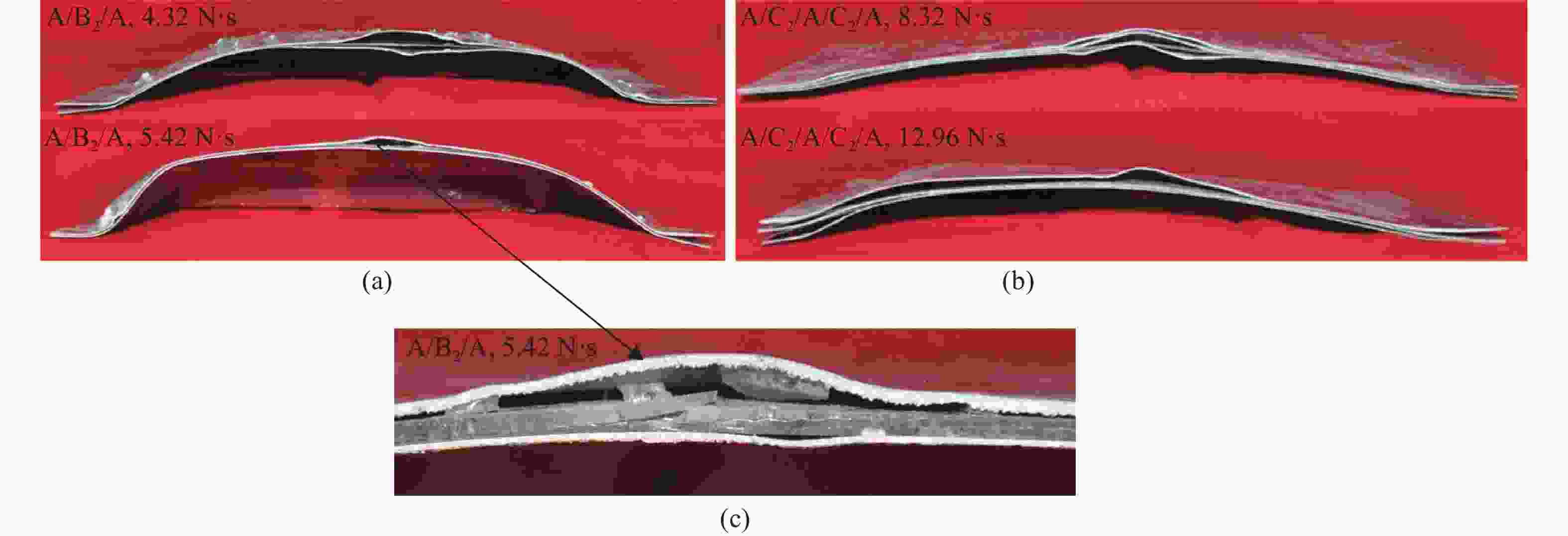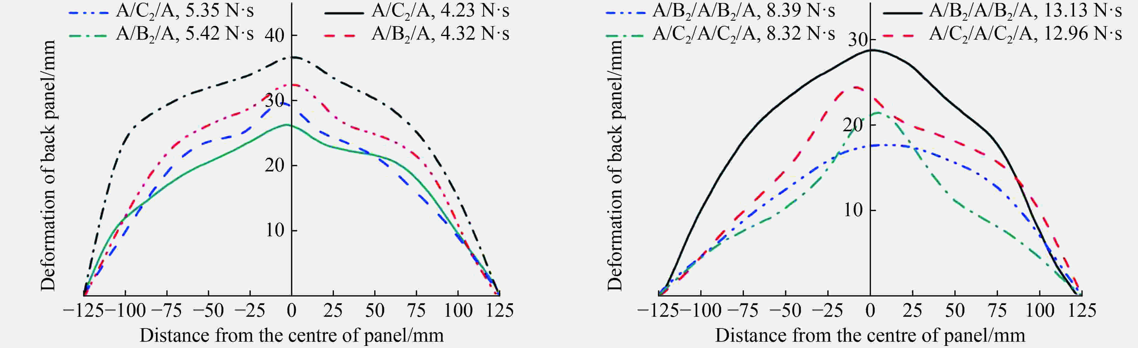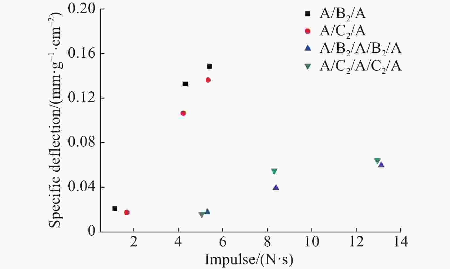 Sample configuration ms/g H/mm me/g I/(N·s) γ/mm A3 218.2 0.94 5.0 5.07 A/B2/A 223.8 0.95 5.0 5.42 36.95 A/B2/A 203.2 0.91 3.0 4.32 29.96 A/B2/A 214.8 0.94 1.0 1.16 5.01 A/C2/A 220.2 1.02 5.0 5.35 32.55 A/C2/A 225.3 1.07 3.0 4.23 26.64 A/C2/A 214.8 1.05 1.0 1.69 4.36 A/B2/A/B2/A 424.6 1.71 9.0 13.13 28.41 A/B2/A/B2/A 398.5 1.67 7.0 8.39 17.57 A/B2/A/B2/A 406.2 1.67 5.0 5.31 8.21 A/C2/A/C2/A 349.4 1.86 9.0 12.96 24.88 A/C2/A/C2/A 348.5 1.85 7.0 8.32 21.35 A/C2/A/C2/A 348.6 1.84 5.0 5.06 6.24 -