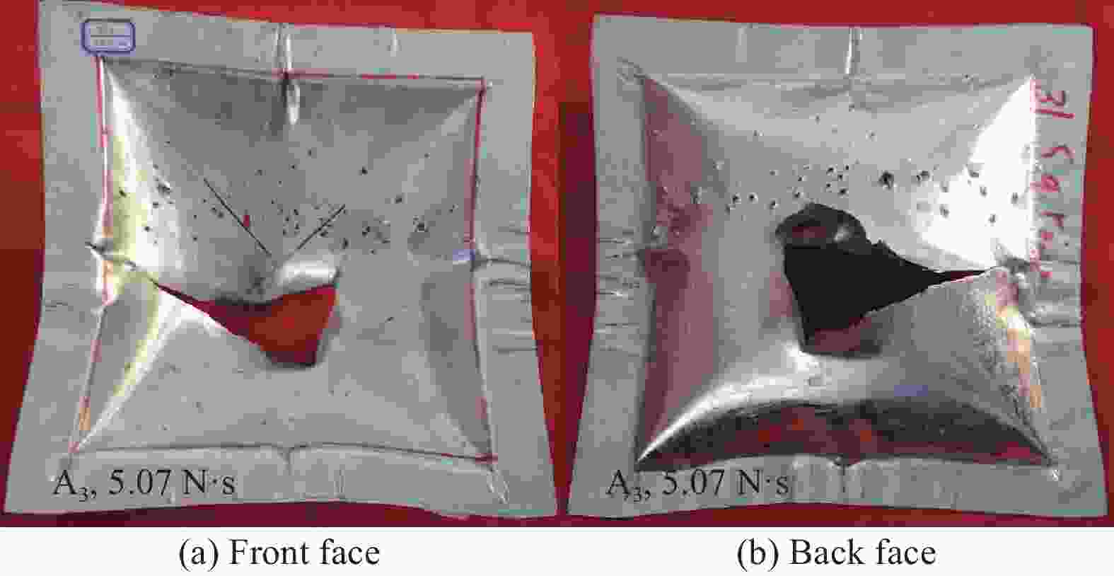 Material Type ρ/(g·m–2) σb/GPa E/GPa h/mm σs/MPa ε/% ν Aluminum alloy Al-6061 810 0.124 68.9 0.30 103 12.0 0.33 Carbon fiber cloth HexForceTM 282 197 4.654 231 0.26 1.8 Basalt fiber cloth FGMW0002 210 4.300 100 0.15 3.1 表 2 FML爆炸实验结果