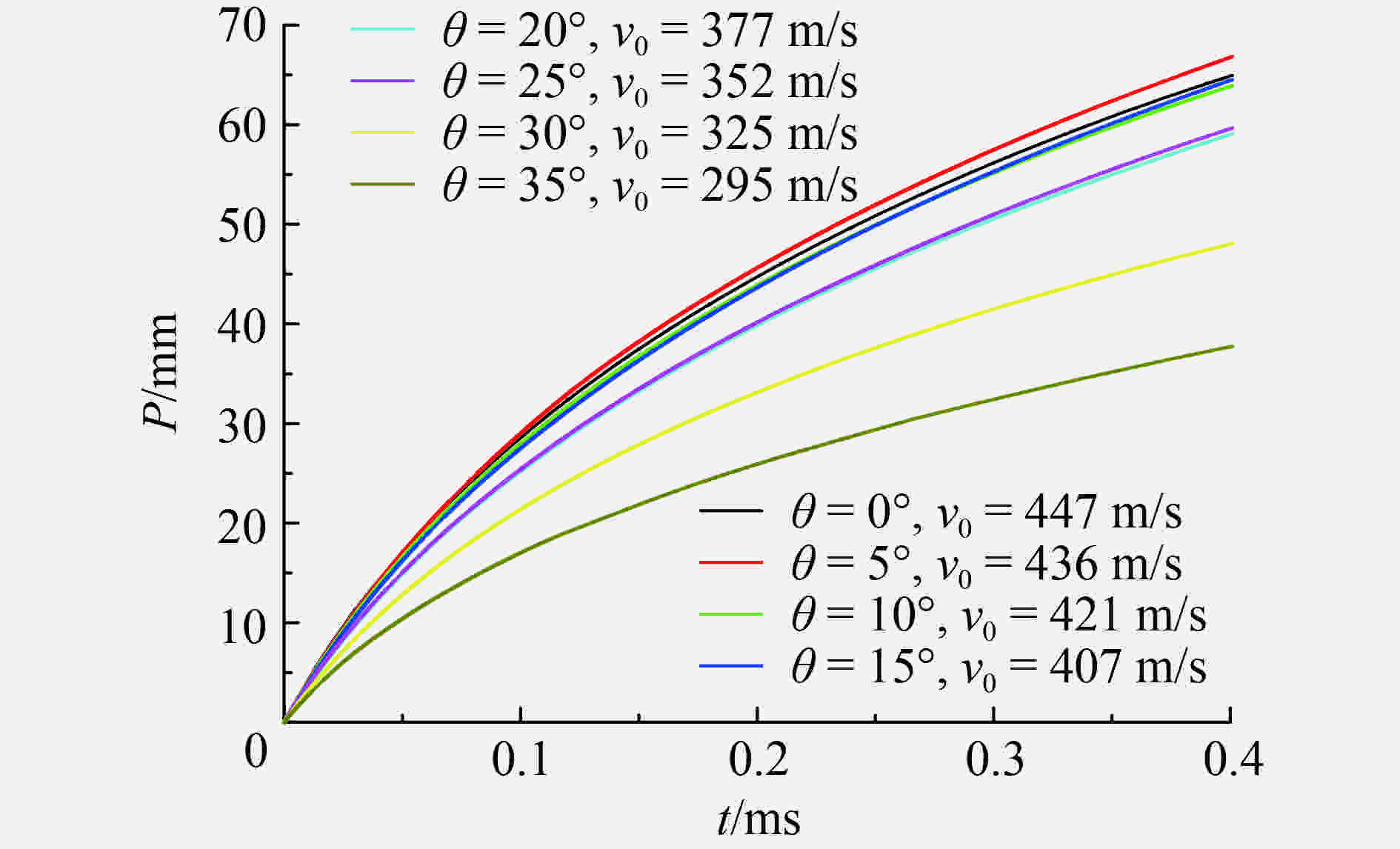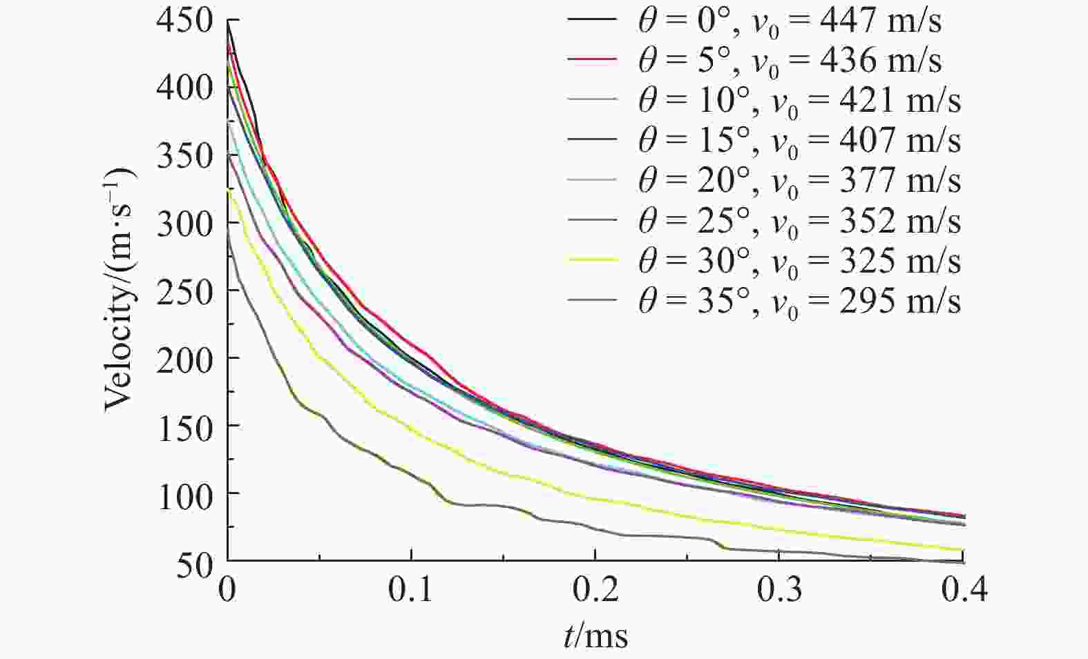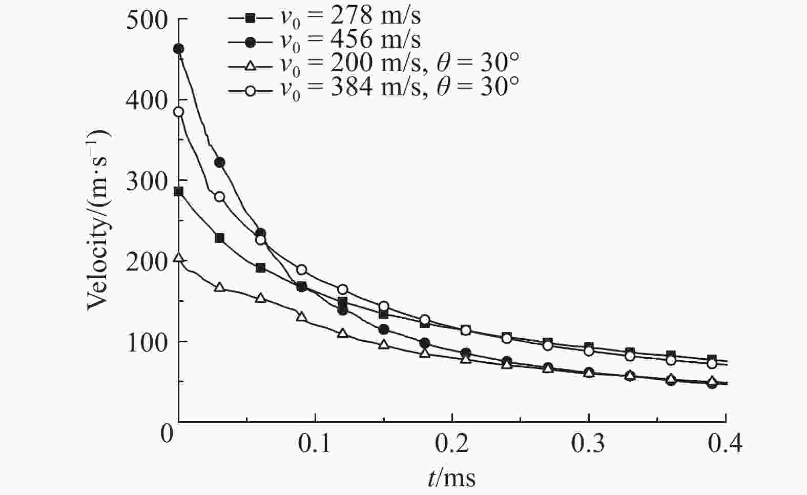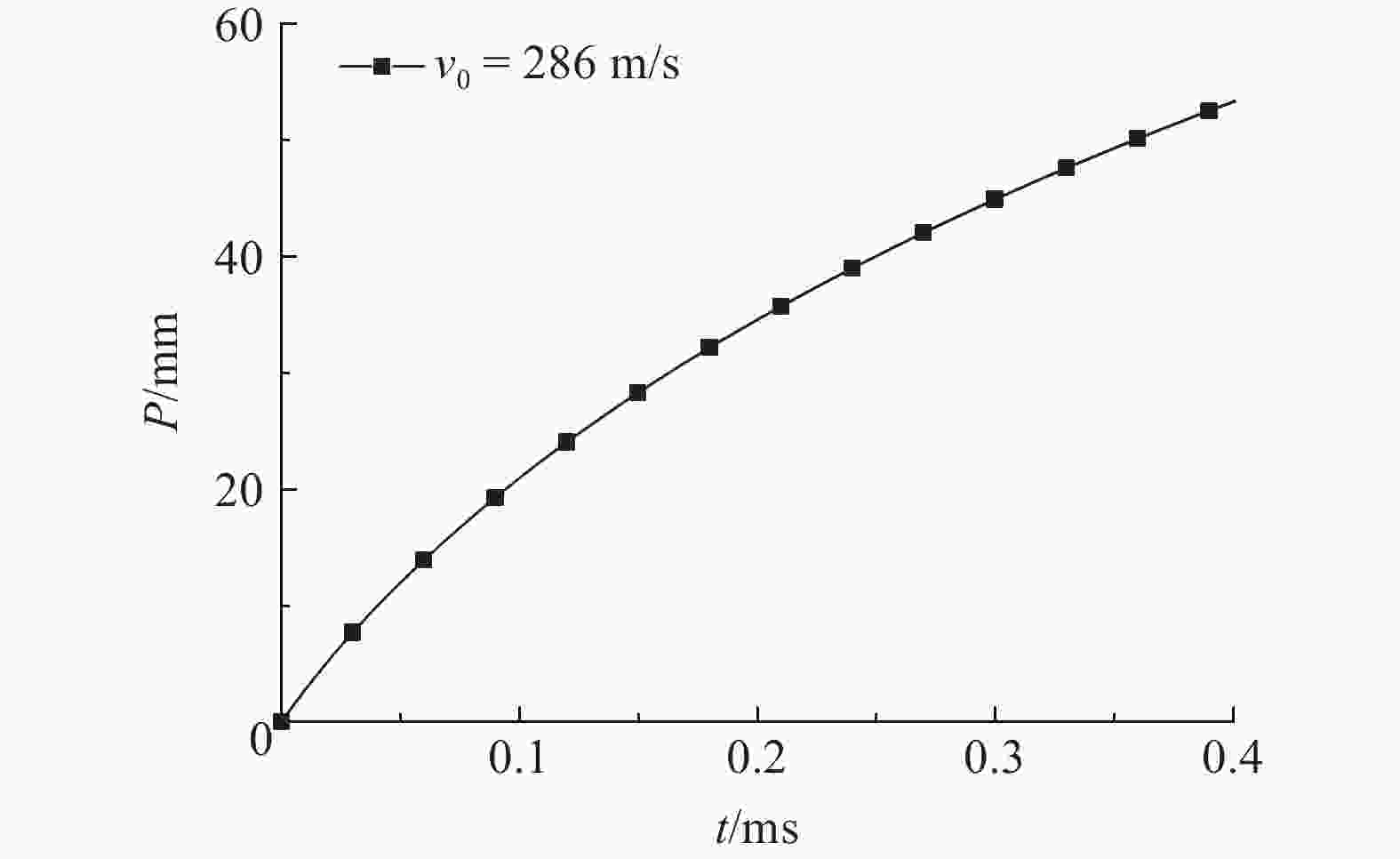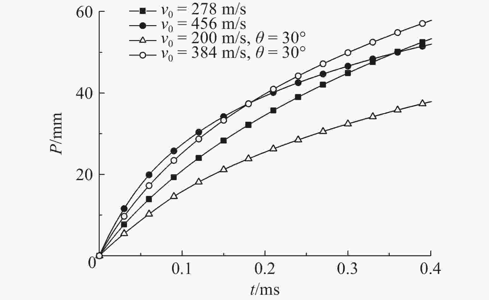 Case θ/(°) v0/(m·s–1) vw/(m·s–1) Deviation/% Experiment[12] Simulation 1 0 1 105.0 286.0 278 –3.0 2 0 1 231.2 462.7 456 –1.4 3 30 1 058.1 202.9 200 –1.4 4 30 1 290.3 385.9 384 –0.5 表 2 弹体初速与侵彻深度的关系