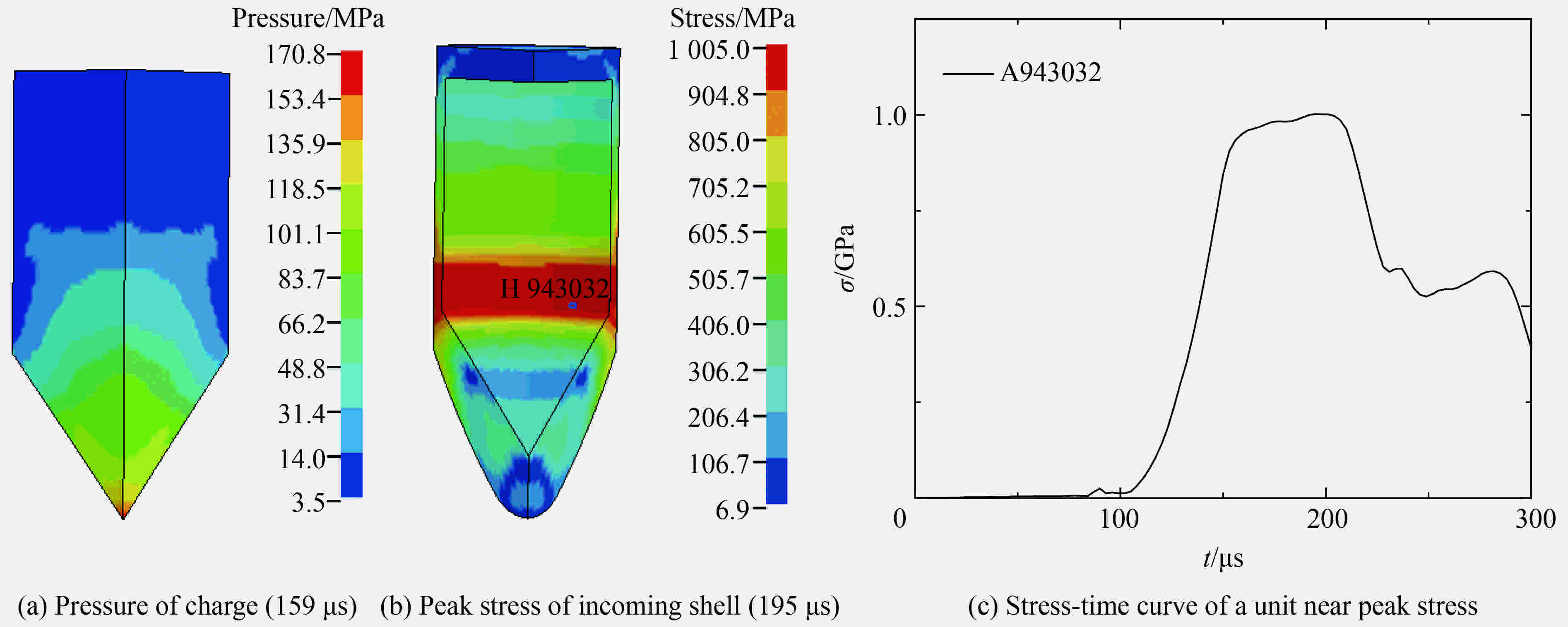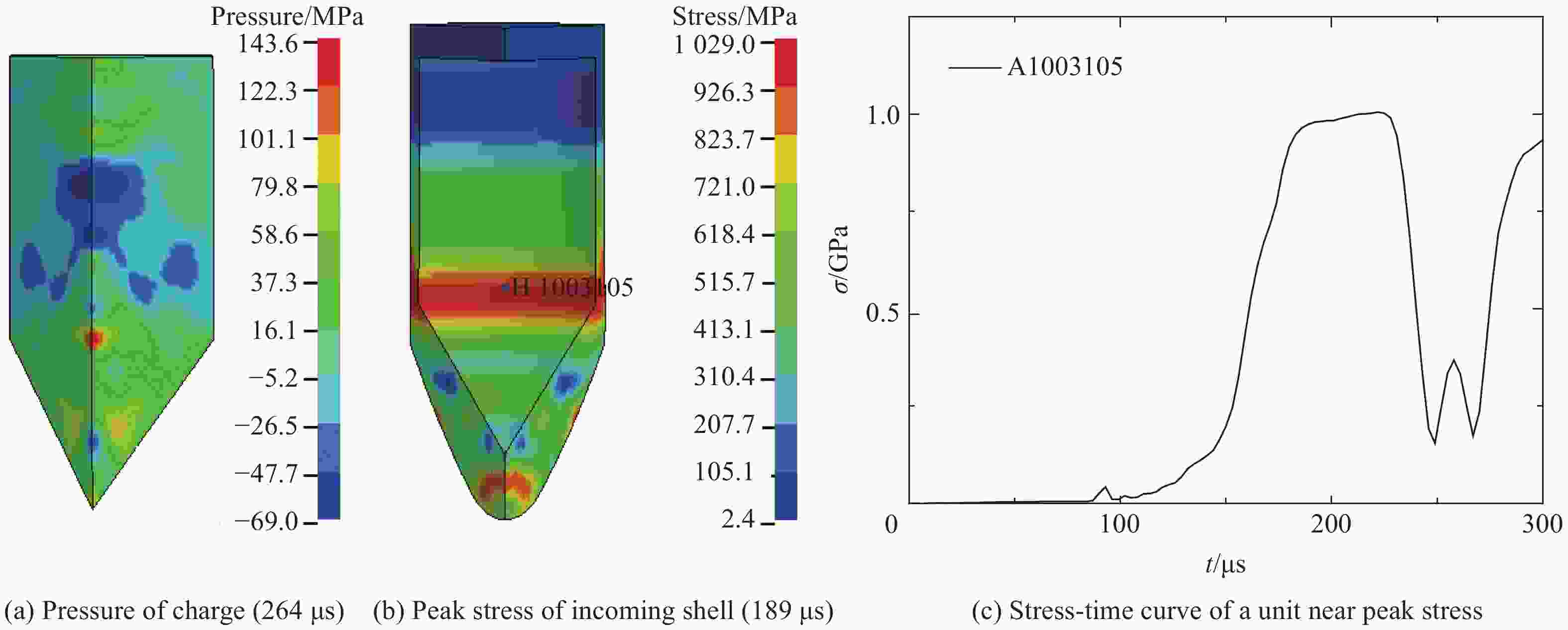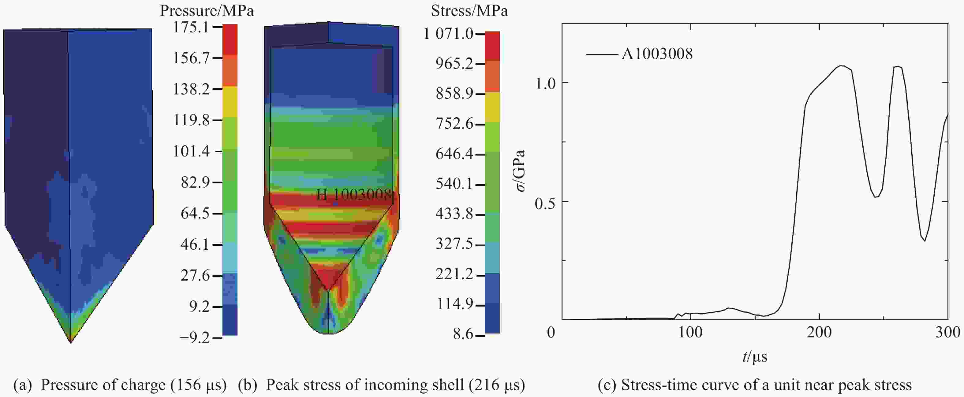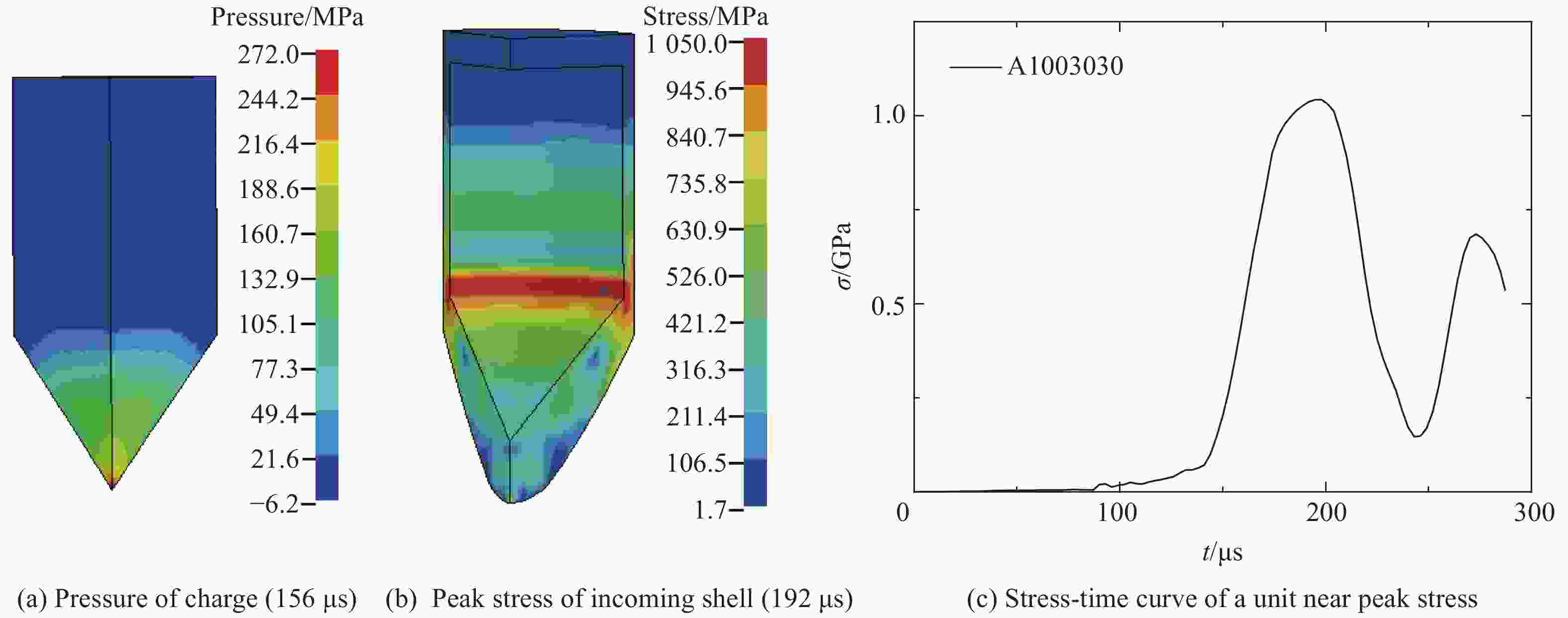 摘要: 为了有效提升串联切割战斗部隔爆结构衰减爆炸冲击波的性能,解决前级聚能装药结构与后级随进弹的匹配及隔爆问题,在前级切割器和后级随进弹之间加装隔爆结构,使用有限元分析软件ANSYS/LS-DYNA建立模型,进行不同组合结构隔爆性能的数值模拟,比较隔爆能力。模拟结果表明:前级装药起爆后,爆炸冲击波首先向后级随进弹头靠里区域汇聚,而不是向弹头尖端区域汇聚,因此可以适当减薄外层金属隔爆介质头部尖端区域;将外层金属由硬质钢改成铝时,后端壳体应力峰值的变化很小,故确定外层金属介质为铝;铝-聚脲的隔爆能力优于铝-泡沫铝结构,最终确定“软”隔爆介质为聚脲。通过调整铝和聚脲层的厚度,确定了最佳隔爆参数,能够满足实际应用。Abstract: In this work we improved the explosion shock wave mitigation capability of the interruption structure in the tandem cutting warhead and matched the front shaped charge with the post-stage projectile and the explosive interruption by installing the explosive interruption structure between the front cutter and the rear following projectile, and established the simulation model using ANSYS/LS-DYNA, a finite element analysis software. We also analyzed the mitigation capabilities of the structures in different combinations and compared their explosive interruption capabilities using numerical simulation. The results showed that the explosion shock wave first converged to the inner region of the projectile, rather than to the tip of the warhead, so that the tip area of the outer metal flameproof medium was thinned properly. When the outer metal turned from hard steel to aluminum, little change was observed in the stress peak value of the rear end shell, suggesting that the outer metal medium was aluminum. Judging by the comparative study, the aluminum polyurea flameproof capability was superior to the aluminum foam-aluminum structure. Finally, the "soft" explosive interruption medium was determined to be polyurea, and the best explosion proof parameters were determined by adjusting the thickness of the aluminum and polyurea layer, which serves the needs of practical applications.