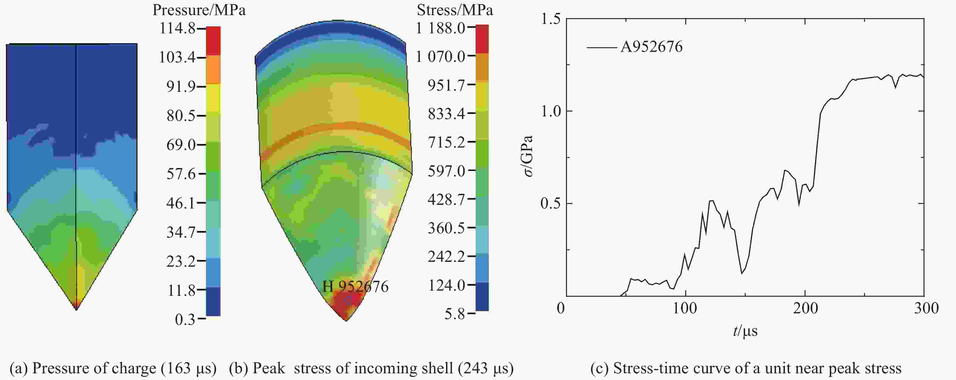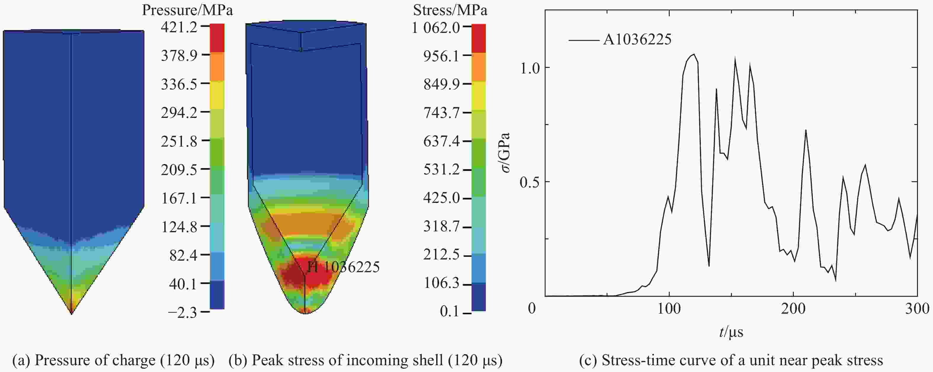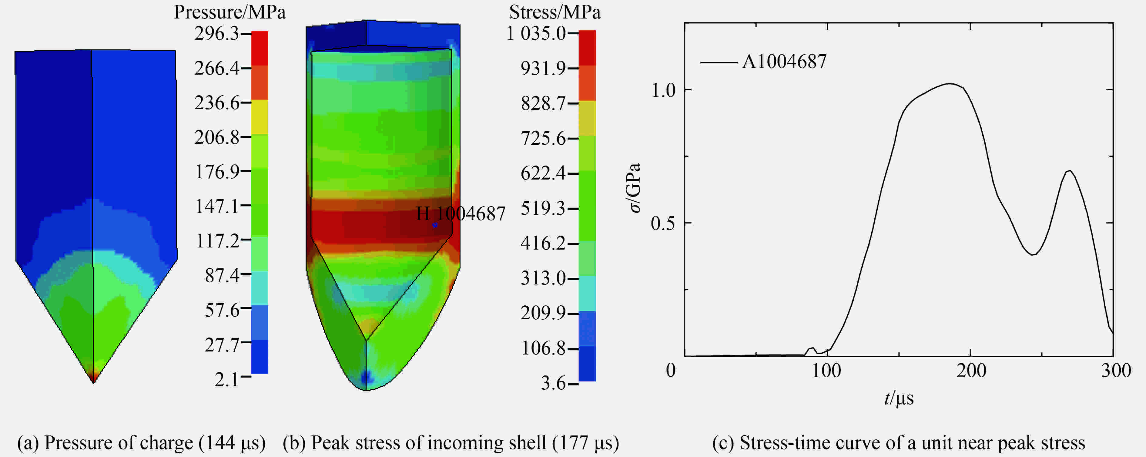 摘要: 为了有效提升串联切割战斗部隔爆结构衰减爆炸冲击波的性能,解决前级聚能装药结构与后级随进弹的匹配及隔爆问题,在前级切割器和后级随进弹之间加装隔爆结构,使用有限元分析软件ANSYS/LS-DYNA建立模型,进行不同组合结构隔爆性能的数值模拟,比较隔爆能力。模拟结果表明:前级装药起爆后,爆炸冲击波首先向后级随进弹头靠里区域汇聚,而不是向弹头尖端区域汇聚,因此可以适当减薄外层金属隔爆介质头部尖端区域;将外层金属由硬质钢改成铝时,后端壳体应力峰值的变化很小,故确定外层金属介质为铝;铝-聚脲的隔爆能力优于铝-泡沫铝结构,最终确定“软”隔爆介质为聚脲。通过调整铝和聚脲层的厚度,确定了最佳隔爆参数,能够满足实际应用。Abstract: In this work we improved the explosion shock wave mitigation capability of the interruption structure in the tandem cutting warhead and matched the front shaped charge with the post-stage projectile and the explosive interruption by installing the explosive interruption structure between the front cutter and the rear following projectile, and established the simulation model using ANSYS/LS-DYNA, a finite element analysis software. We also analyzed the mitigation capabilities of the structures in different combinations and compared their explosive interruption capabilities using numerical simulation. The results showed that the explosion shock wave first converged to the inner region of the projectile, rather than to the tip of the warhead, so that the tip area of the outer metal flameproof medium was thinned properly. When the outer metal turned from hard steel to aluminum, little change was observed in the stress peak value of the rear end shell, suggesting that the outer metal medium was aluminum. Judging by the comparative study, the aluminum polyurea flameproof capability was superior to the aluminum foam-aluminum structure. Finally, the "soft" explosive interruption medium was determined to be polyurea, and the best explosion proof parameters were determined by adjusting the thickness of the aluminum and polyurea layer, which serves the needs of practical applications.